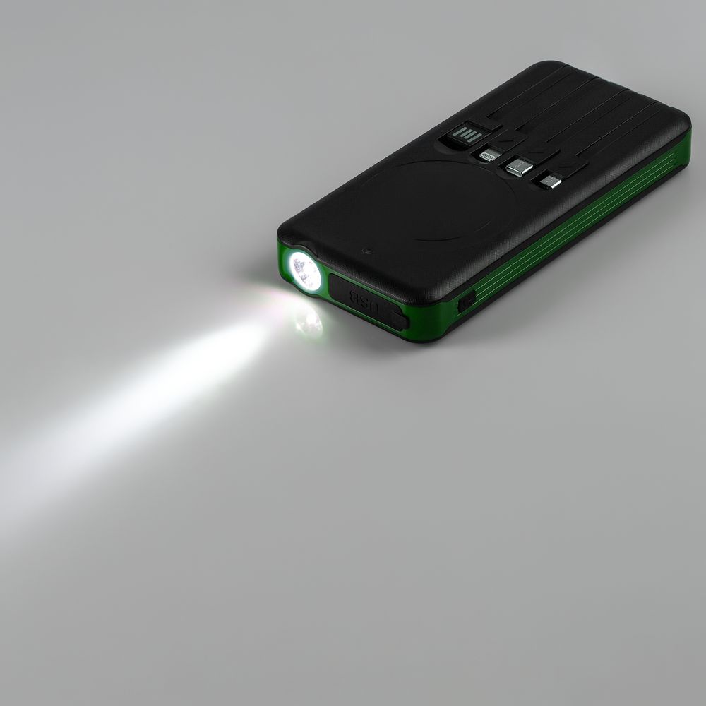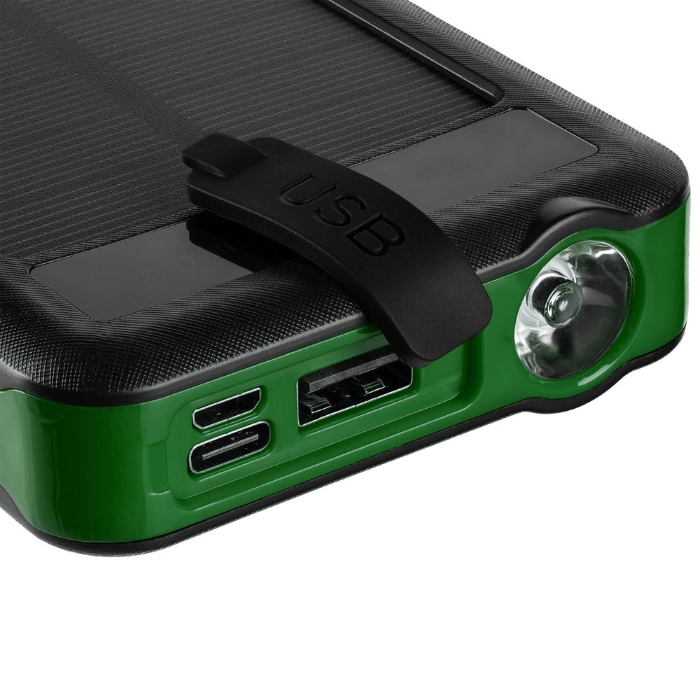 Holiday Maker — outdoor-аккумулятор с ударопрочным корпусом и защитой от пыли и брызг, который не страшно взять в поход. 3 встроенных кабеля с разъемами micro USB, Type-C и Lightning позволяют удобно заряжать разные типы устройств, а солнечная батарея поможет не остаться совсем без связи. Яркий фонарик осветит путь или послужит сигнальным маячком.