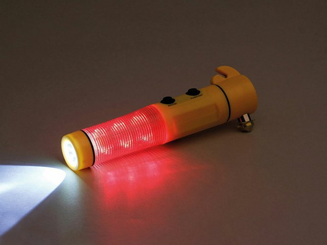 Аварийный молоток с магнитом, резаком ремней безопасности автомобиля и фонариком с 1 белым и 3 красными сигнальными светодиодами. Укомплектован 2 батарейками АА. Упакован в коробке. ø38 x 193 мм.