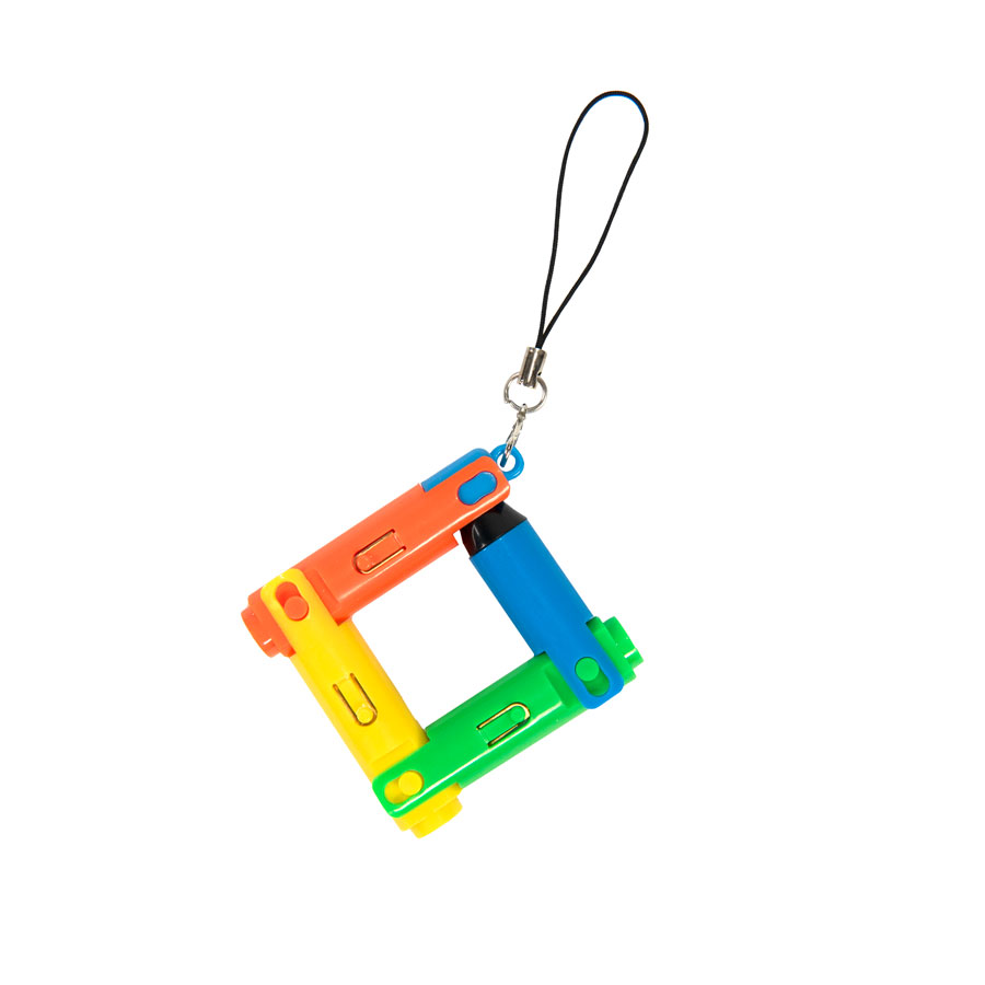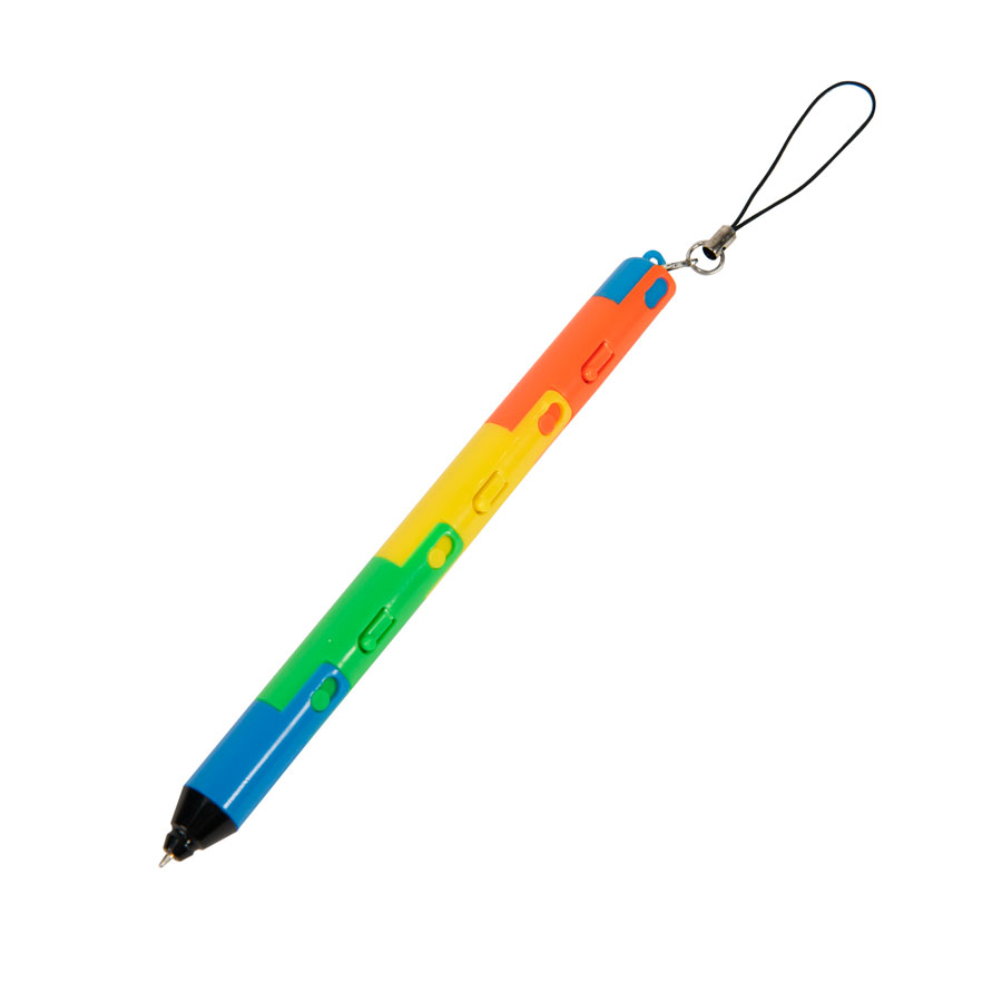 Яркая, необычная ручка-трансформер может складываться в разноцветный брелок-фонарик.
