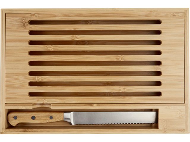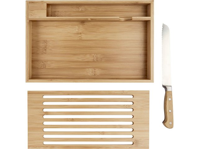 Бамбуковая разделочная доска с хлебным ножом с бамбуковыми ручками. Благодаря горизонтальной открытой модели крошки падают в поддон, что позволяет сохранить рабочее место или обеденный стол чистым. Размер ножа: 34 x 3 см. Бамбуковое дерево, нержавеющая сталь.