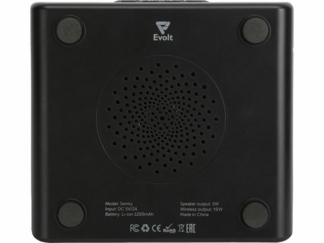 Беспроводная колонка с часами и функцией беспроводной зарядки Sentry от Evolt. Устройство может работать автономно, что позволяет использовать его в любой точке квартиры и за ее пределами и избавиться от проводов на рабочем столе. Колонка подключается к смартфону при помощи Bluetooth, имеет большой динамик, занимающий собой всю нижнюю панель Sentry.