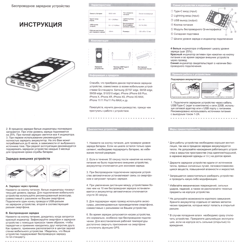- Qi беспроводной интерфейс (wireless output): 5V/1.0A (5W)