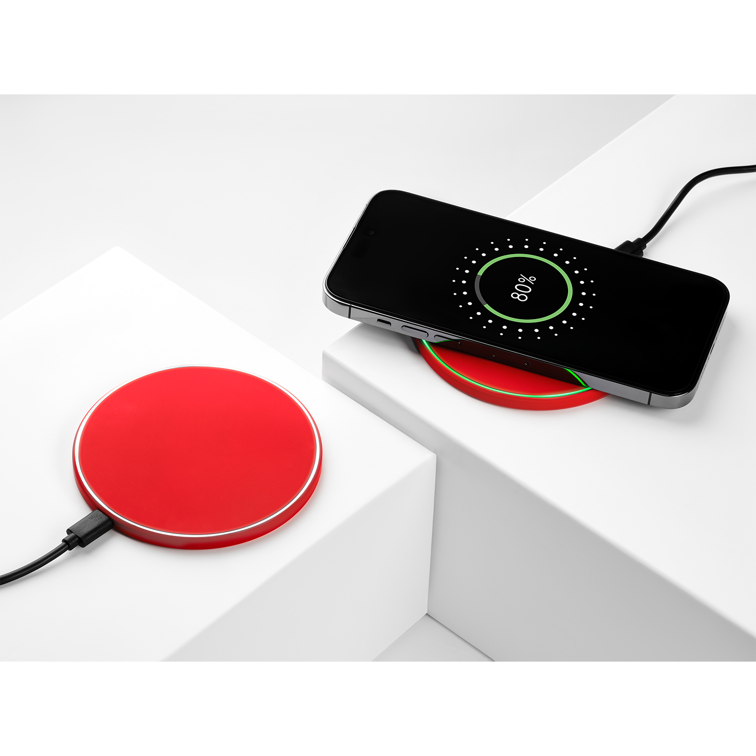 Беспроводное зарядное устройство 15W с подсветкой и покрытием soft-touch. Встроенная LED-панель позволяет создать эффектную подсветку логотипа посредством лазерной гравировки, удачно завершая композицию аксессуара.