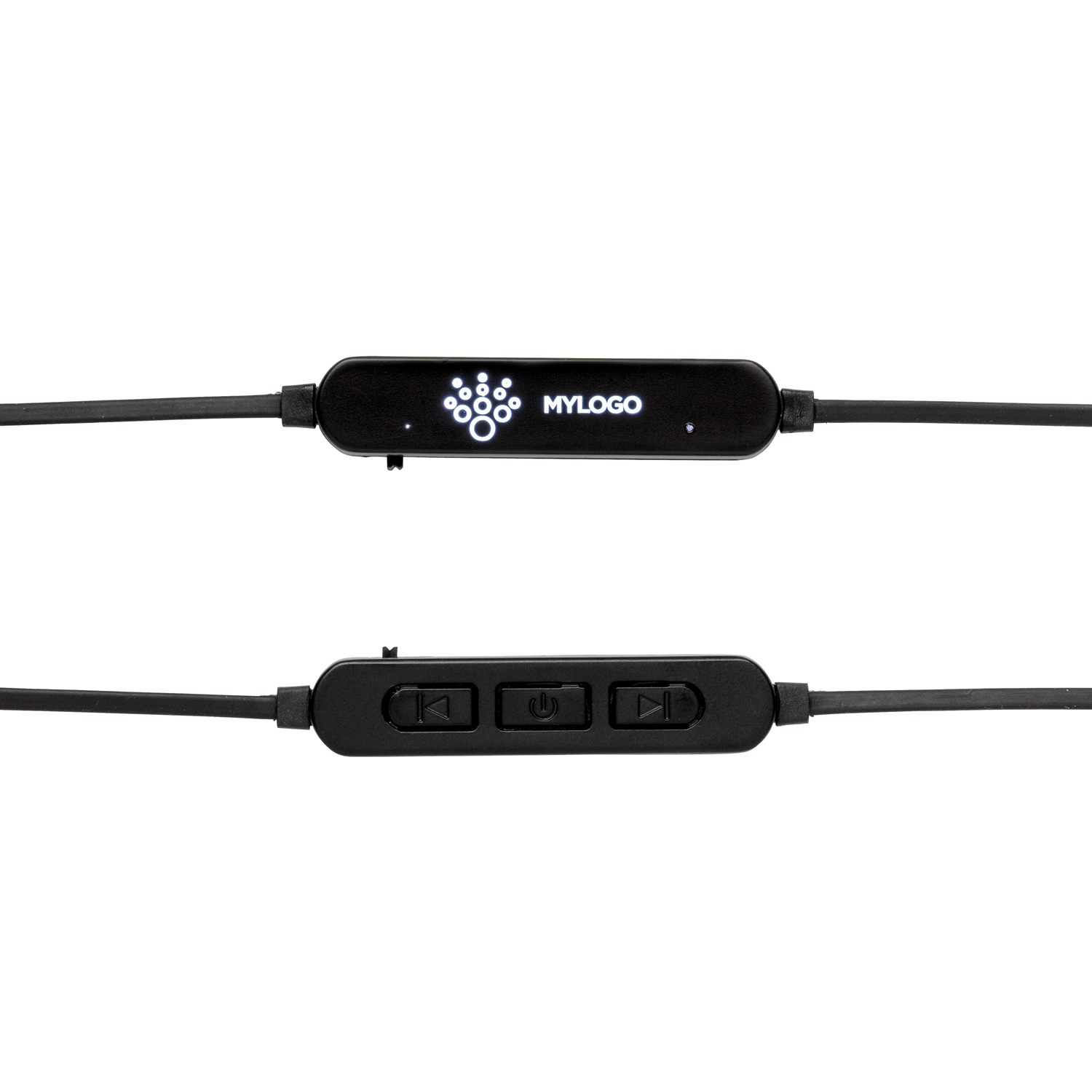 Беспроводные наушники, которые можно кастомизировать вашим подсвеченным логотипом, нанесенным на пульт управления. Bluetooth версии 4.2 для гладкого подключения с рабочего расстояния 10 метров. Встроенный аккумулятор емкостью 55 мАч, который позволяет слушать музыку до 3 часов на одном заряде, а перезарядка занимает 1,5 часа. Функции микрофона и приема входящих звонков.