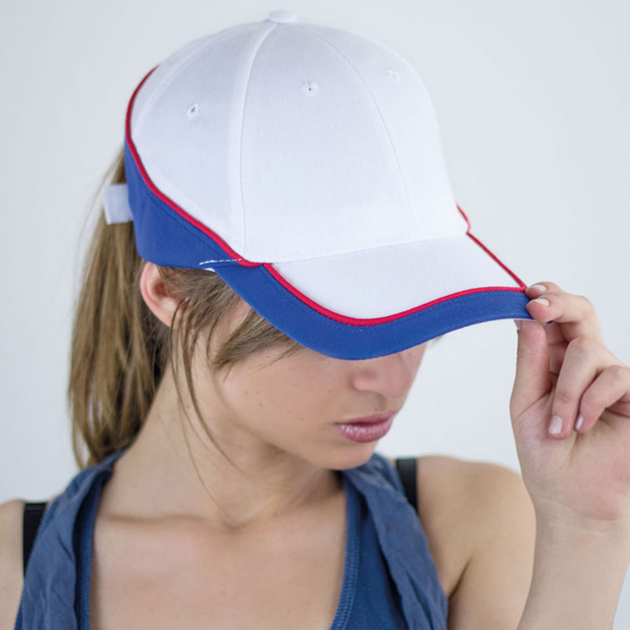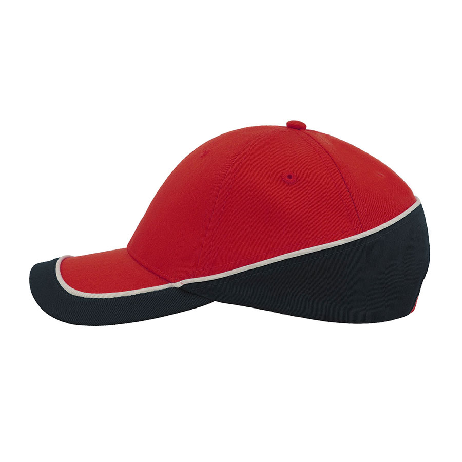 Стильная трехцветная бейсболка RACING: - 6 клиньев,- лобовой шов,- 6 вышитых люверсов для лучшей вентиляции,- застёжка на липучке,- изогнутый козырек, - контрастный кант по всему периметру кепки. Основной цвет, близкий к Pantone 433 C, дополнительный - Pantone White, кант – 7685 C.58 см - минимальный размер, с помощью застёжки его можно увеличить до необходимого.