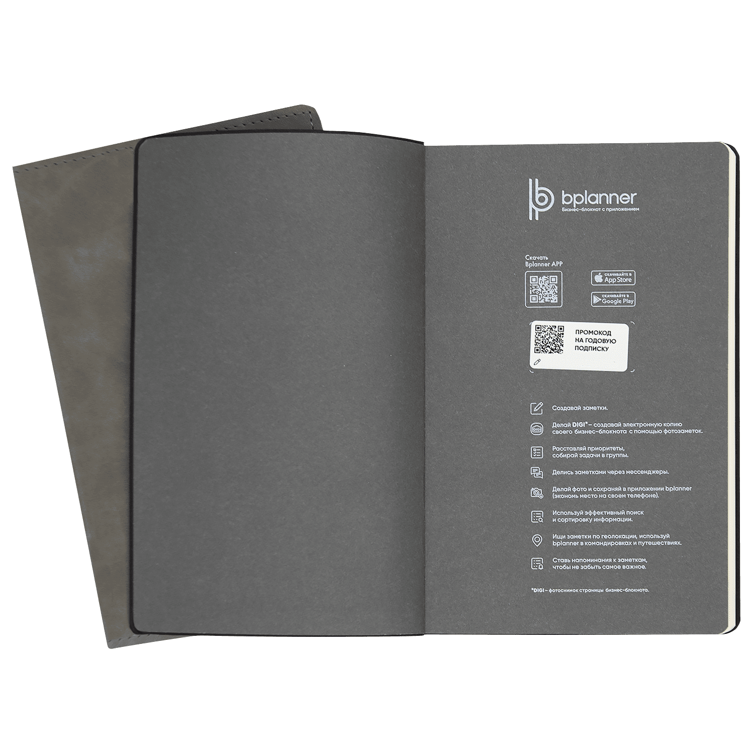 Bplanner. 05 — абсолютно новая модель в линейке Bplanner. Это бизнес-блокнот с недатированным тонированным блоком в клетку. Блок имеет ряд особенностей: наличие титульного листа с возможностью добавления личных данных и контактной информации, трекер воды и шагов на каждой странице и 3 разворота для заметок в конце блокнота. Обложка изготовлена из экокожи Nubuk-touch и имеет прострочку по краю в цвет материала. Фактура материала напоминает замшу или нубук. У блокнотов цветной форзац и нахзац. Блокнот подходит для УФ-печати и тиснения логотипа компании. На форзаце расположен qr-код, который активирует годовой доступ к мобильному приложению.