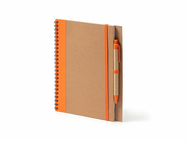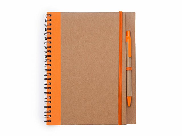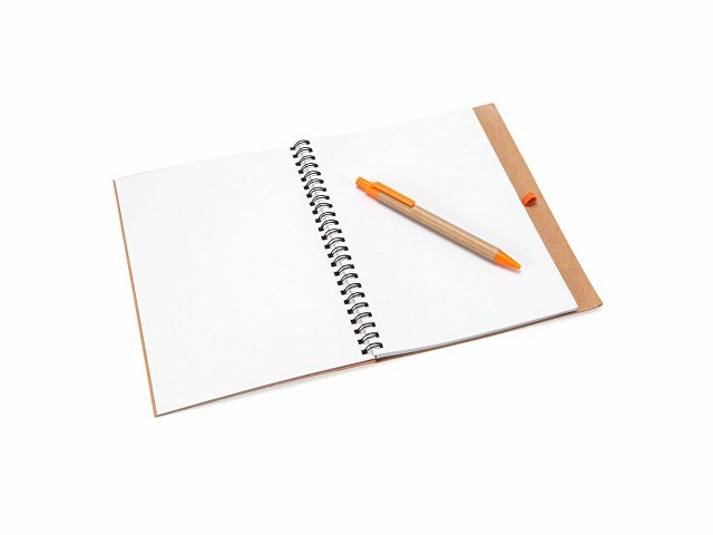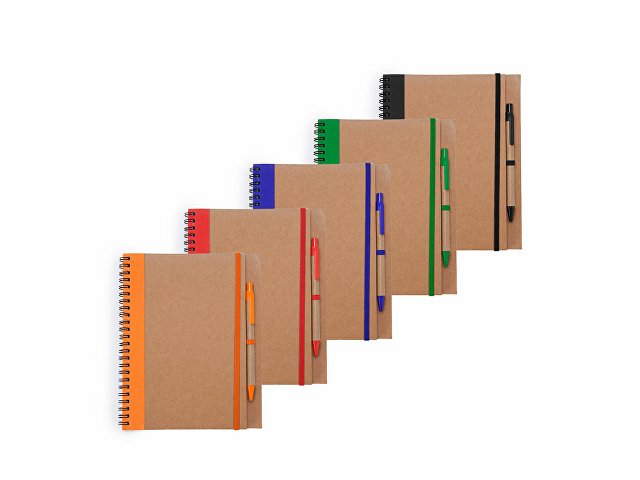 Блокнот на спирали с жесткой обложкой из переработанного картона. Включает шариковую ручку с синими чернилами. 60 простых листов. Трафаретная печать по твердым материалам (1 цвет (цветные изделия)) на данный товар осуществляется бесплатно. Оплачивается только настройка оборудования в размере 6400 рублей на весь тираж.