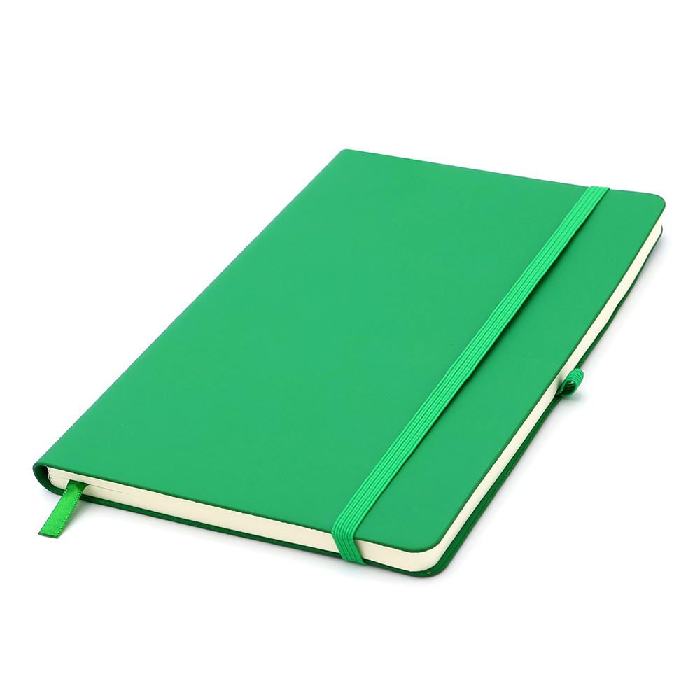 Блокнот формата А5 с мягким покрытием из PU-материала с имитацией рисунка кожи, с эластичной застежкой и текстильной закладкой, наличие петли для ручки в цвет блокнота, 192 страницы, плотность 70г/м, страницы с черными линиями. Цвет по PANTONE® (максимально приближен): 4154C.