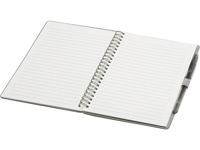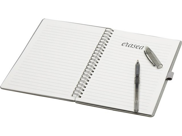 Многоразовый набор из ручки и блокнота в мягкой обложке из каменной бумаги. Блокнот имеет обложку из картона, закругленные углы и 32 листа линованной бумаги плотностью 120 г/м². В производстве каменной бумаги не используется дерево, а на сам процесс изготовления затрачивается гораздо меньше энергии в сравнении с производством переработанной или целлюлозной бумаги. Сзади имеется карман для хранения черной протирочной ткани (входит в комплект). Ручка из переработанного пластика с стираемыми чернилами, прозрачным корпусом, белым ластиком сверху и однотонной цветной рукояткой. Цвет чернил: черный. Длина непрерывной линии: 250 метров. Размер пера: 0,7 мм.