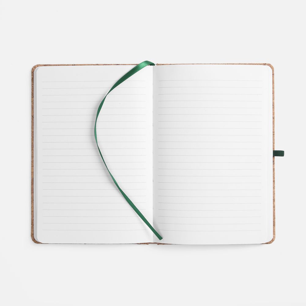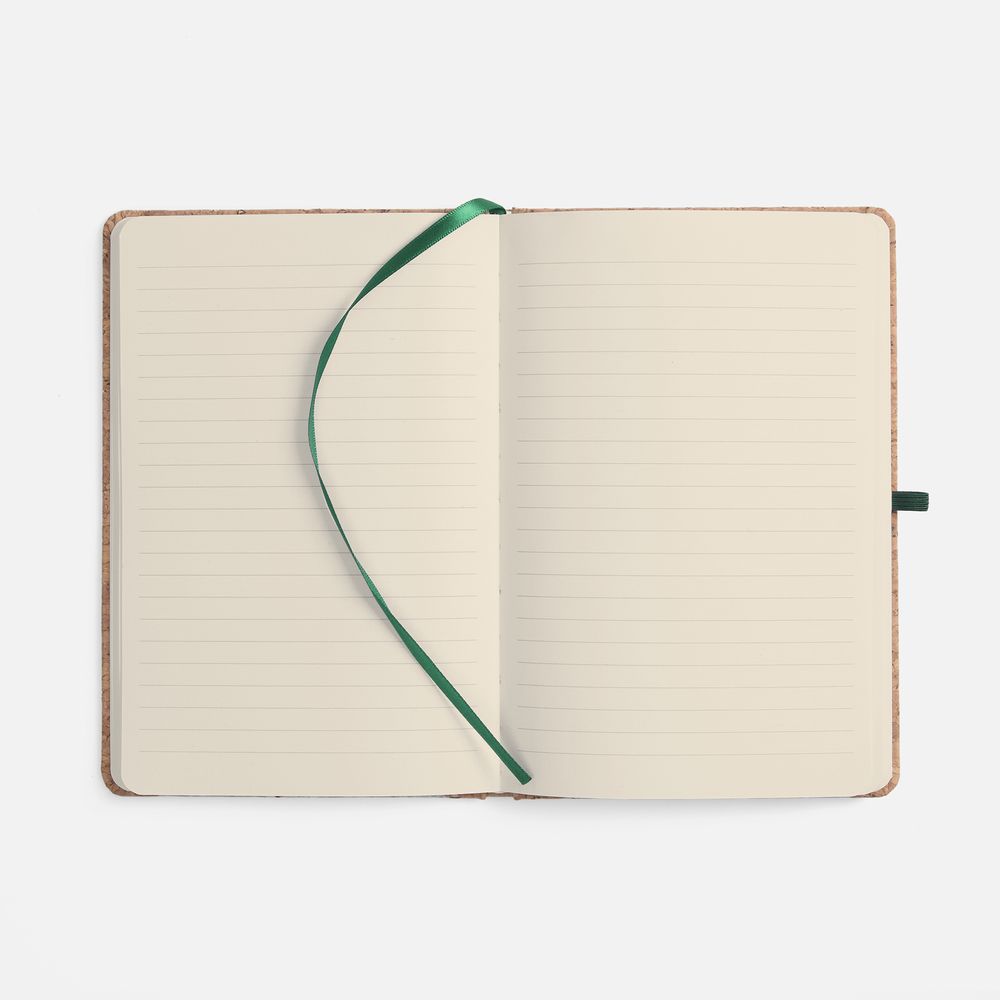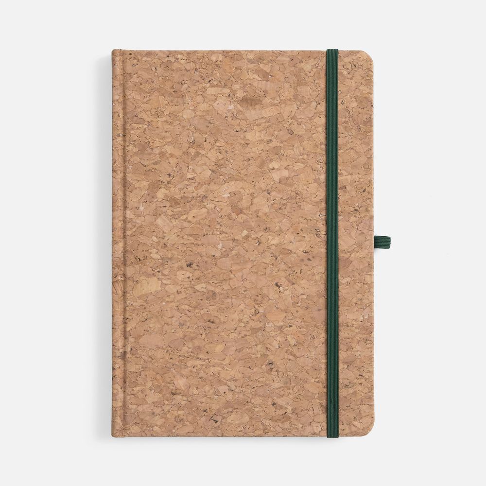 Блокнот в твердой обложке из натуральной неокрашенной пробки, дополнен цветными петлей-резинкой для ручки, ляссе и резинкой на обложку.