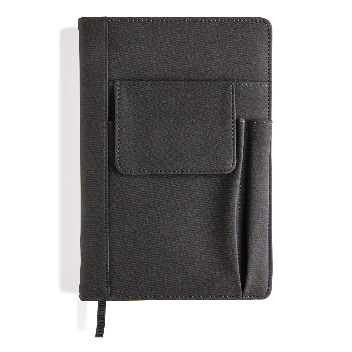 Тканевая обложка блокнота с передним отделением для телефона (14 х 10 см), с кармашком для пишущих принадлежностей и основным отделением для визиток или внешнего аккумулятора. Блокнот на 80 страниц, плотность бумаги 80 г/м2. После того как блокнот закончится, его легко поменять на новый.