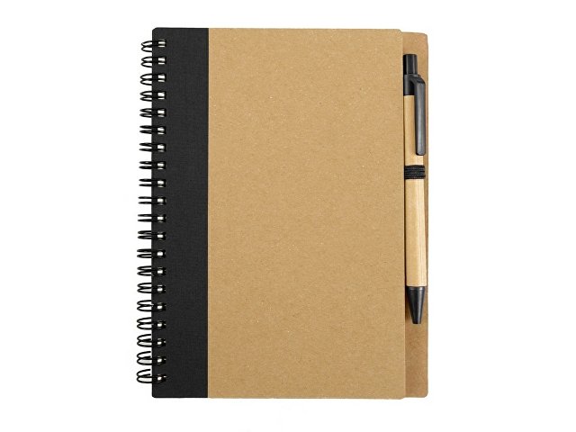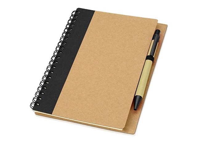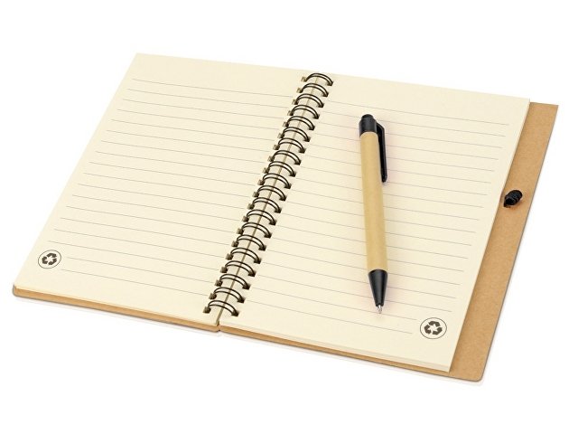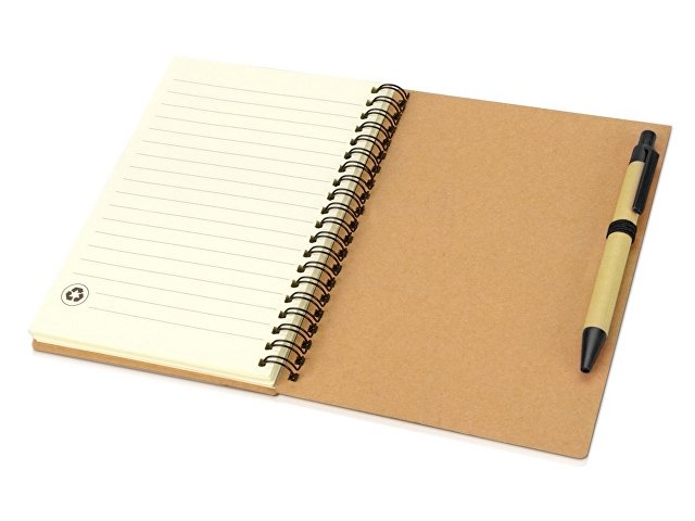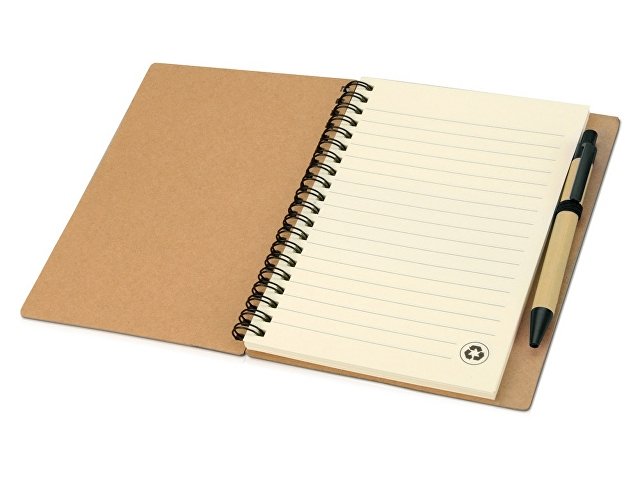 Блокнот с 60 листами переработанной бумаги 70 г/м2 и картонной ручкой в цвет блокнота. Трафаретная печать по твердым материалам (1 цвет (цветные изделия)) на данный товар осуществляется бесплатно. Оплачивается только настройка оборудования в размере 6400 рублей на весь тираж.