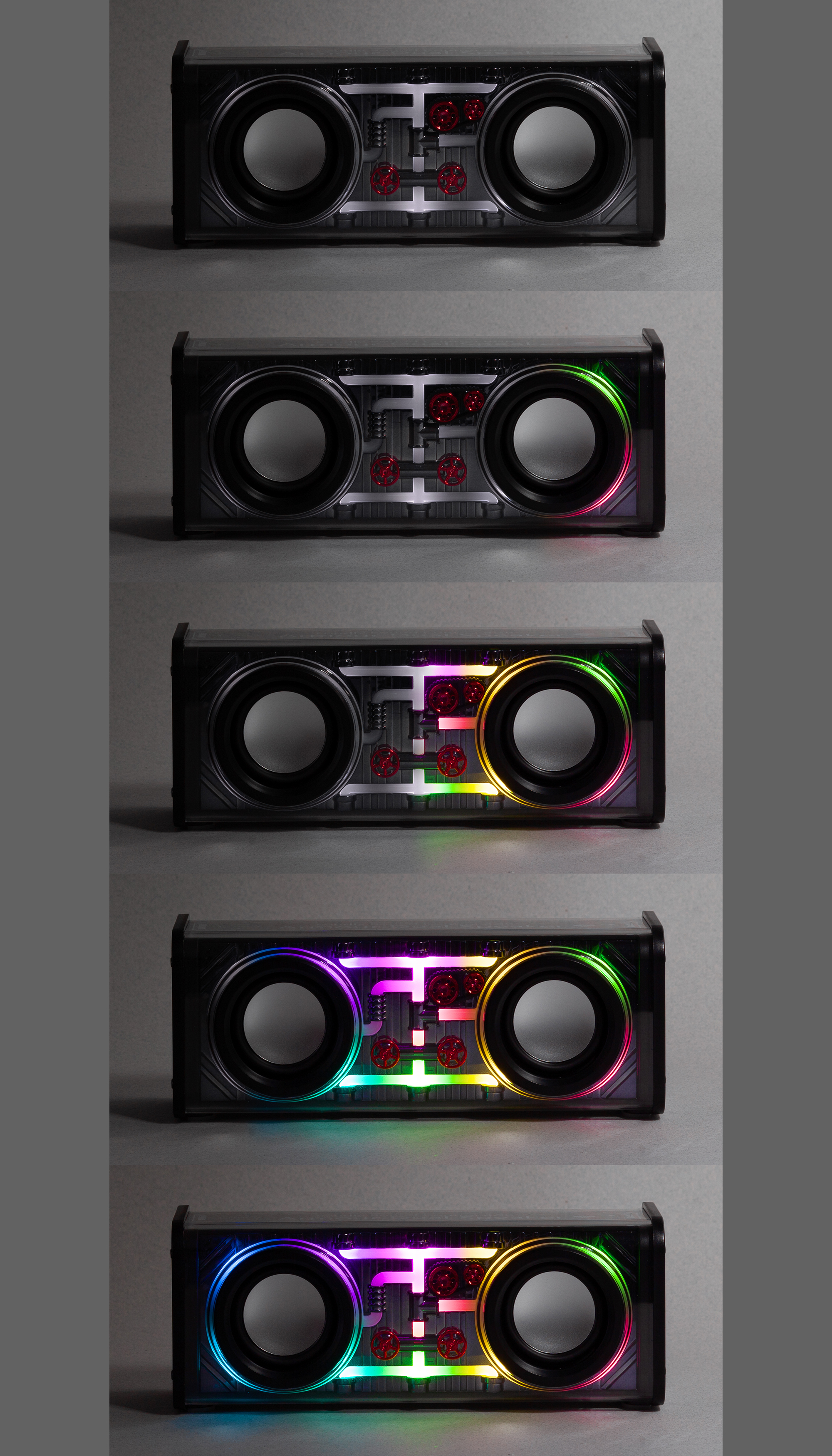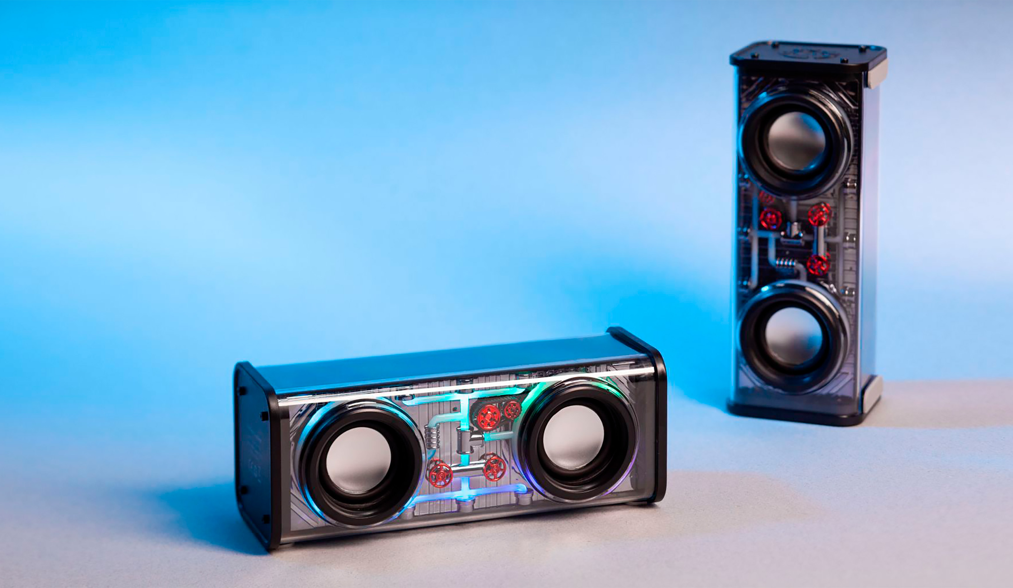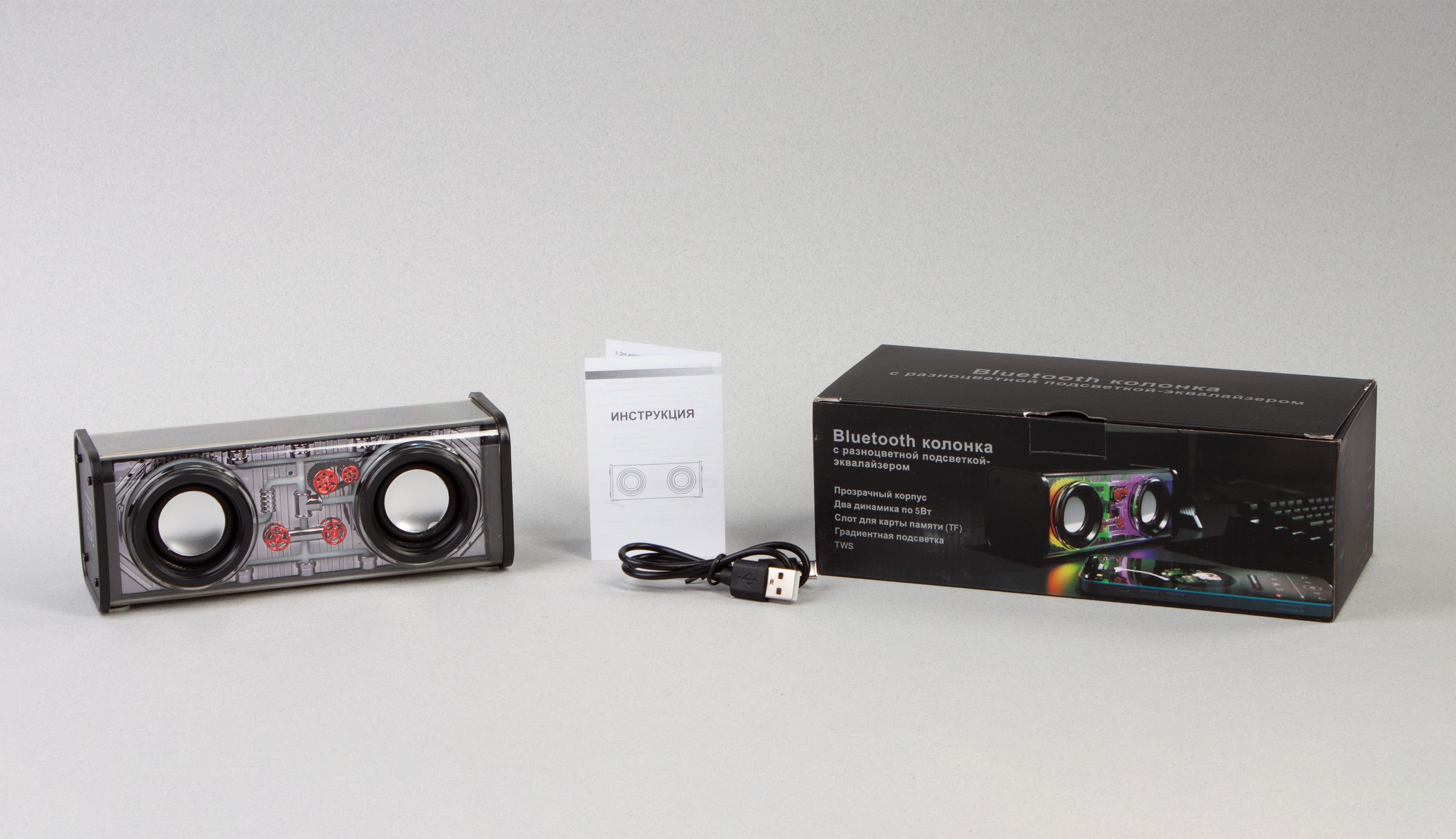 При включении колонка воспроизводит звук мощного автомобильного двигателя. Глубокое, сочное и чистое стереозвучание музыки обеспечивают 2 динамика по 5Вт с усиленными басами. Есть возможность соединить беспроводным способом 2 колонки в пару, создав стереосистему с мощностью звука 20Вт. Более 15 разнообразных режимов разноцветной подсветки при начале воспроизведения музыки превращаются в яркий и эффектный эквалайзер. При необходимости подсветку можно отключить, оставив только воспроизведение звука. Встроенный микрофон добавляет гаджету режим беспроводной гарнитуры hands-free. Также есть возможзность использования TF-карт, слот для них находится на обратной стороне корпуса колонки.