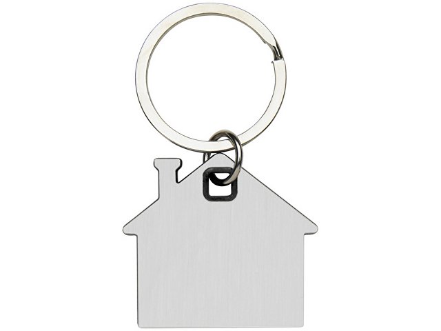 Брелок для ключей в форме домика с цветной вставкой из пластика между 2-мя серебристыми пластинами из стали.