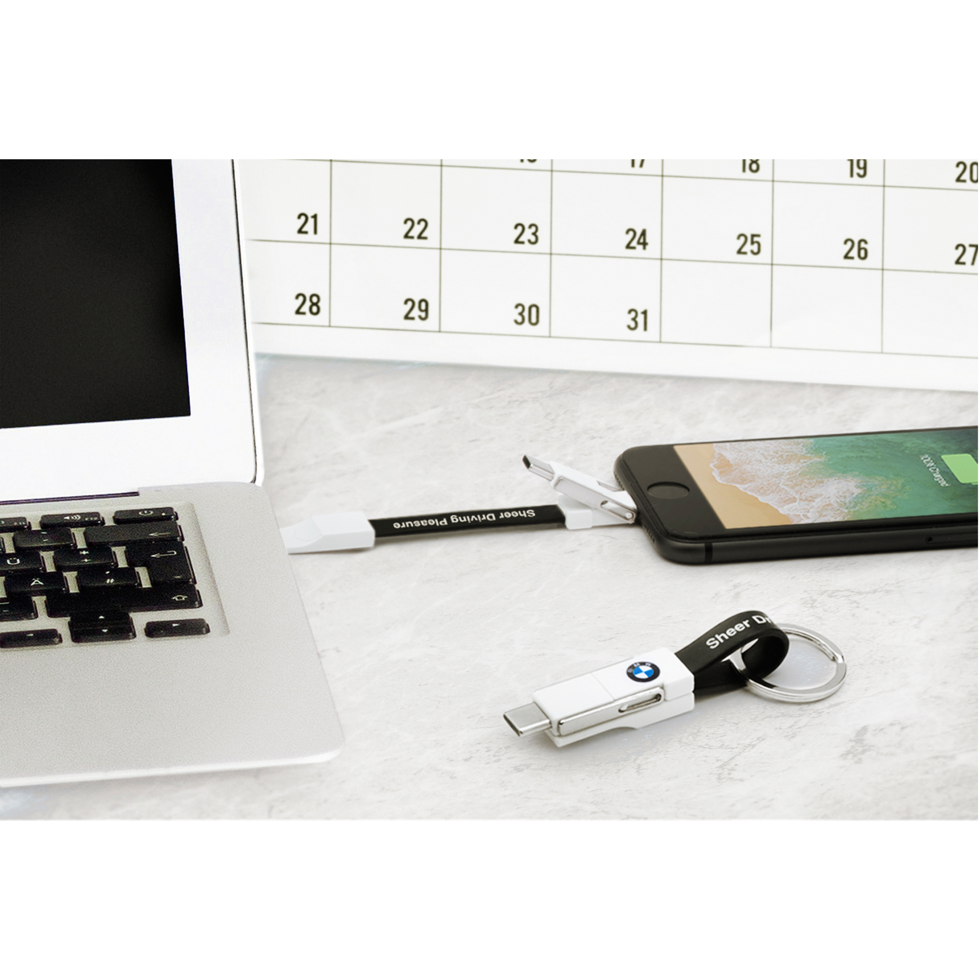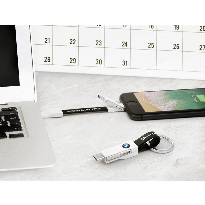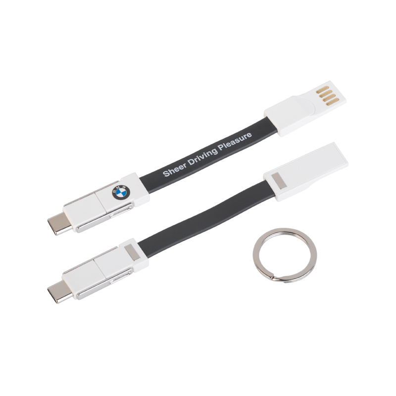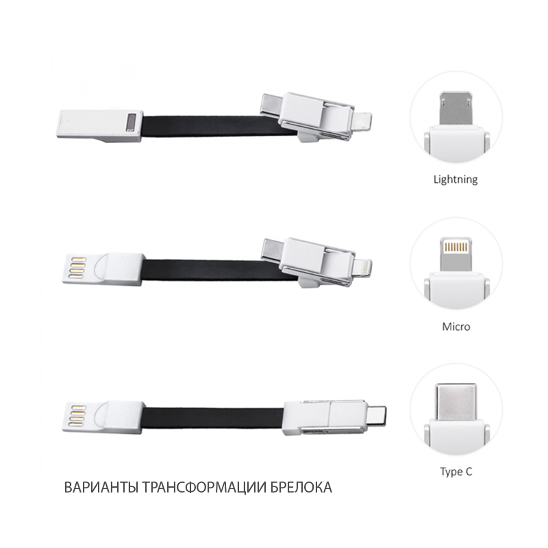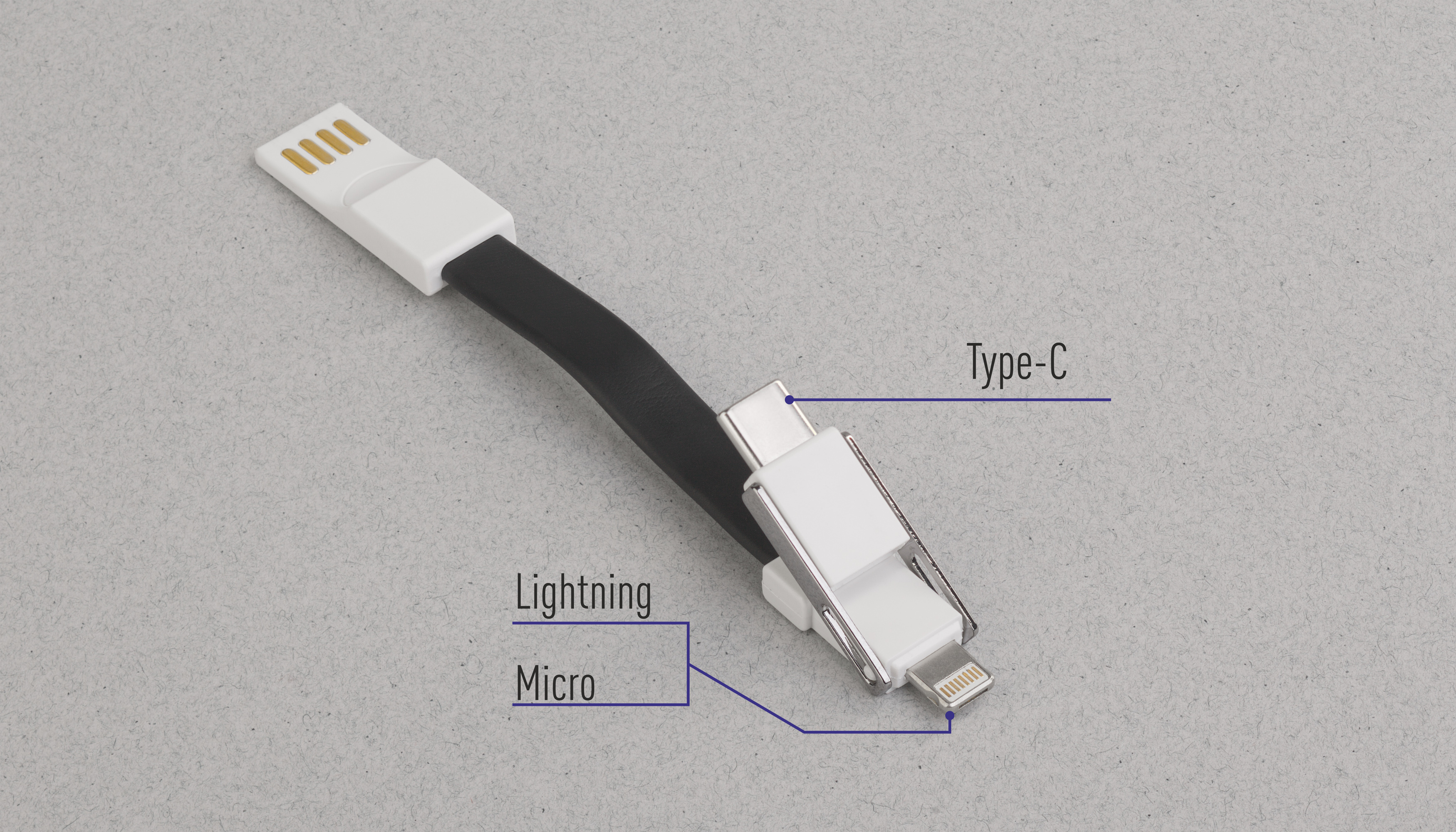 Мультифункциональный кабель в ультракомпактном формате. Наличие разъемов USB/microUSB/USB-C/lightning позволяет использовать аксессуар практически со всеми современными гаджетами и мобильными устройствами. С помощью данного брелока может производиться как зарядка, так и обмен данными между устройствами.