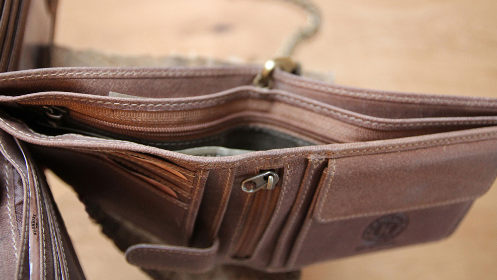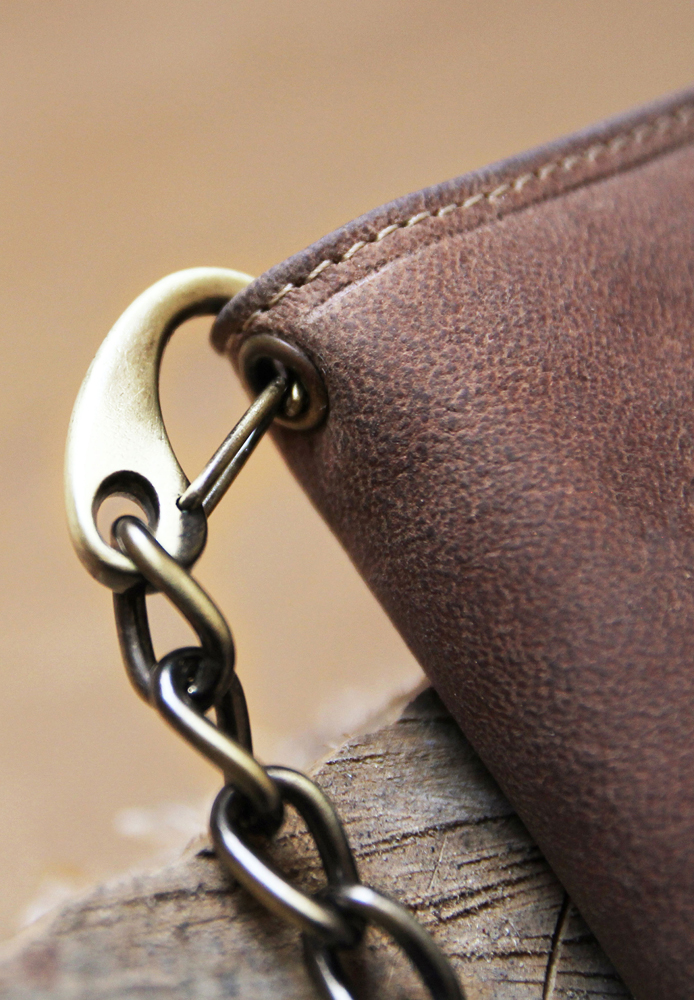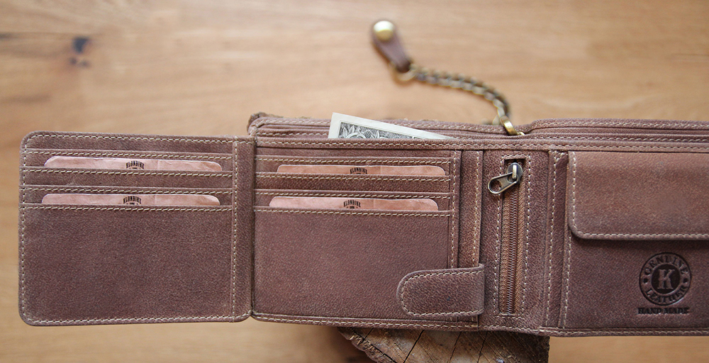 Функциональная организация: 10 отделений для кредитных карт, 2 отделения для купюр, 3 кармана, 2 отделения на молнии, отделение для мелочи, 3 сетчатых кармана, металлическая цепочка с карабином для крепления к поясу