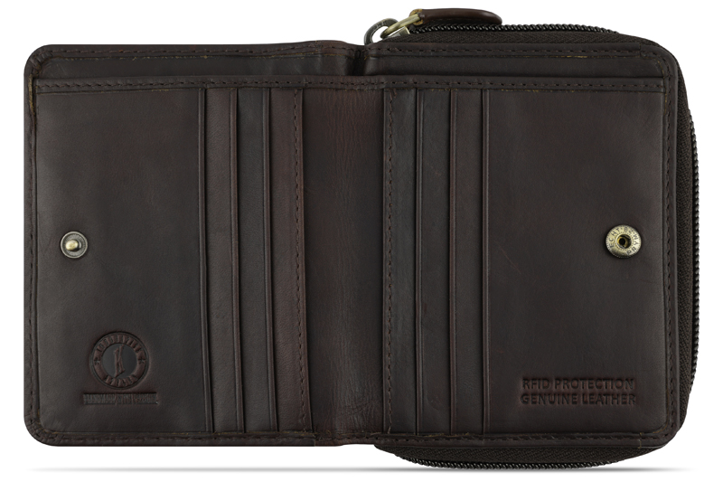 Функциональная организация: основное отделение на молнии и кнопке, отделение для купюр, 10 слотов для кредитных карт, 4 кармана, отделение для монет, защита от сканирования RFID.