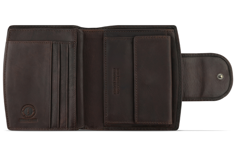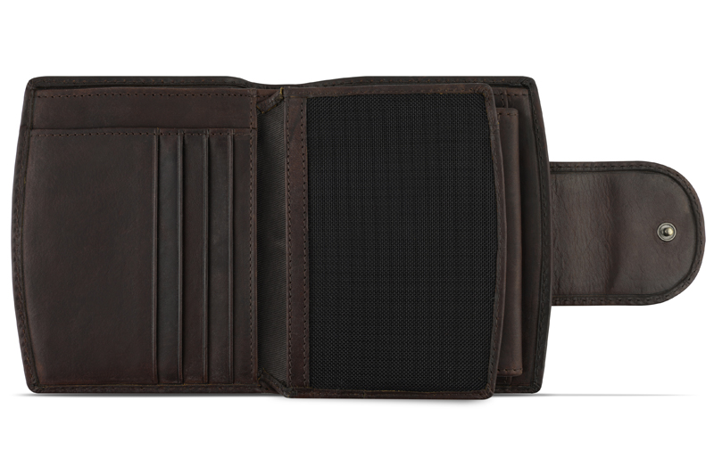 Функциональная организация: основное отделение на кнопке, 2 отделения для купюр, 7 слотов для кредитных карт, 6 карманов, сетчатый карман, отделение для монет, защита от сканирования RFID.