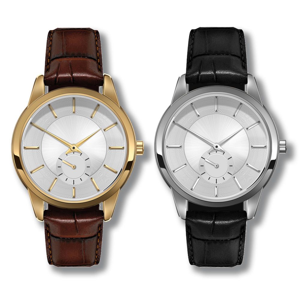 - Ремешок из натуральной кожи с тиснением под кожу крокодила. Коричневого цвета для золотистого корпуса и черного цвета для серебристого корпуса.