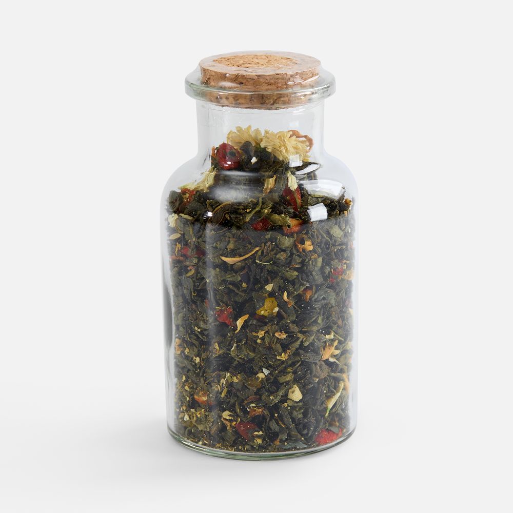 Ягоды годжи и сублимированная клубника добавляют витаминную свежесть, а цветки хризантемы и апельсинового дерева дарят тонкий цветочный аромат.