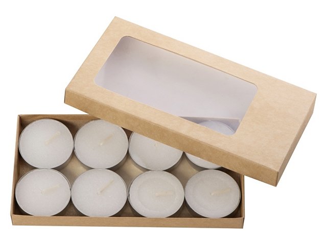 Свечи выполнены из белого воска без запаха, упакованы в крафтовую коробку с прозрачным окошком и перевязаны шелковистой ленточкой. В каждой коробке — 8 свечей.