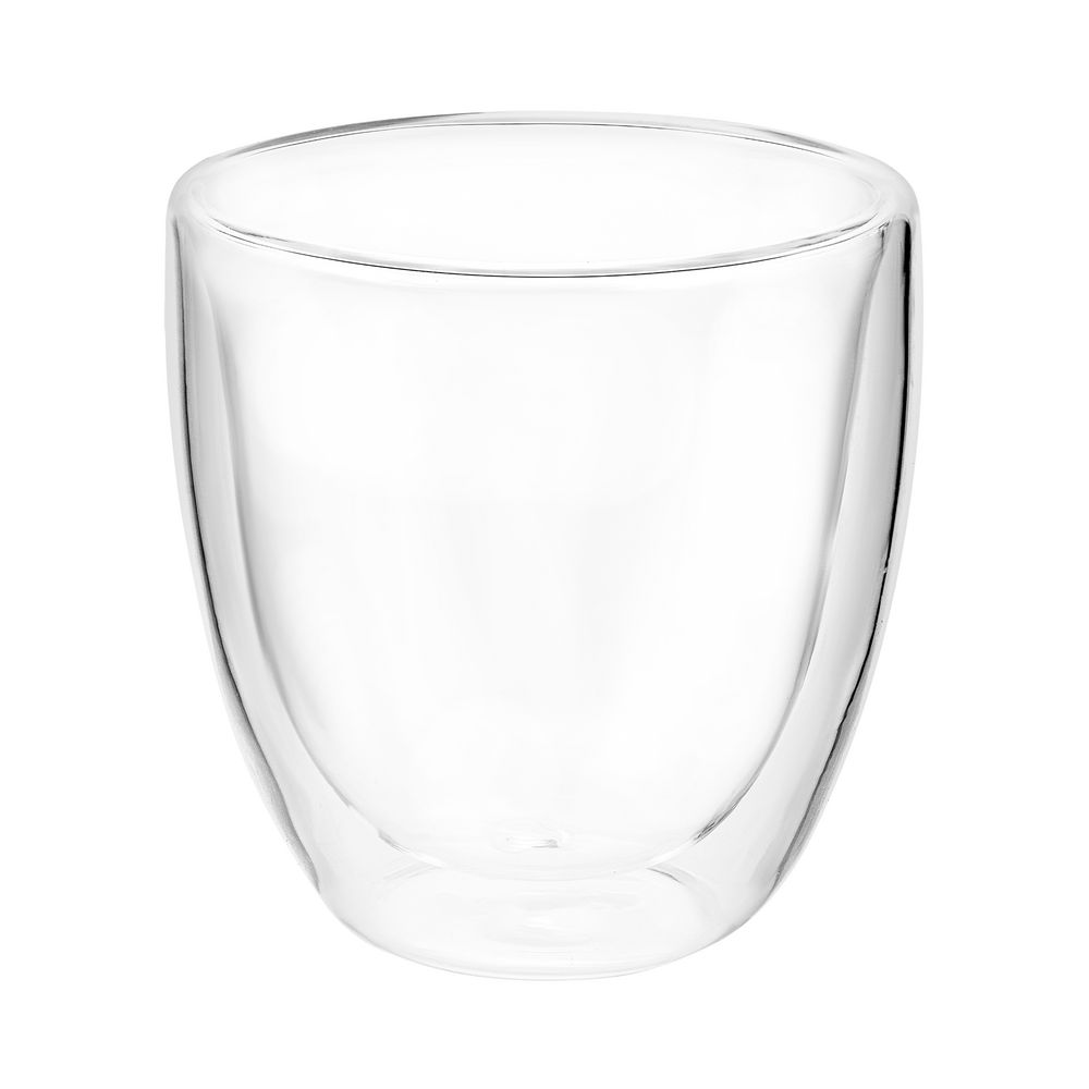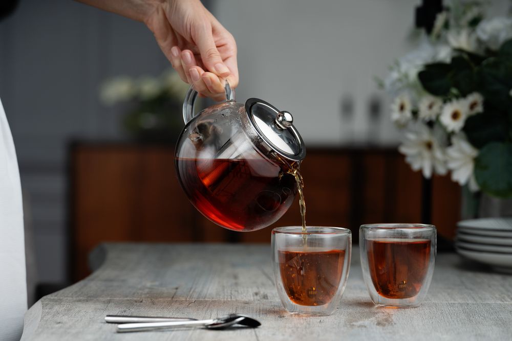Здесь нет ничего лишнего и отвлекающего внимание: объемный чайник и невесомые стаканы с двойными стенками выполнены в современном стиле.