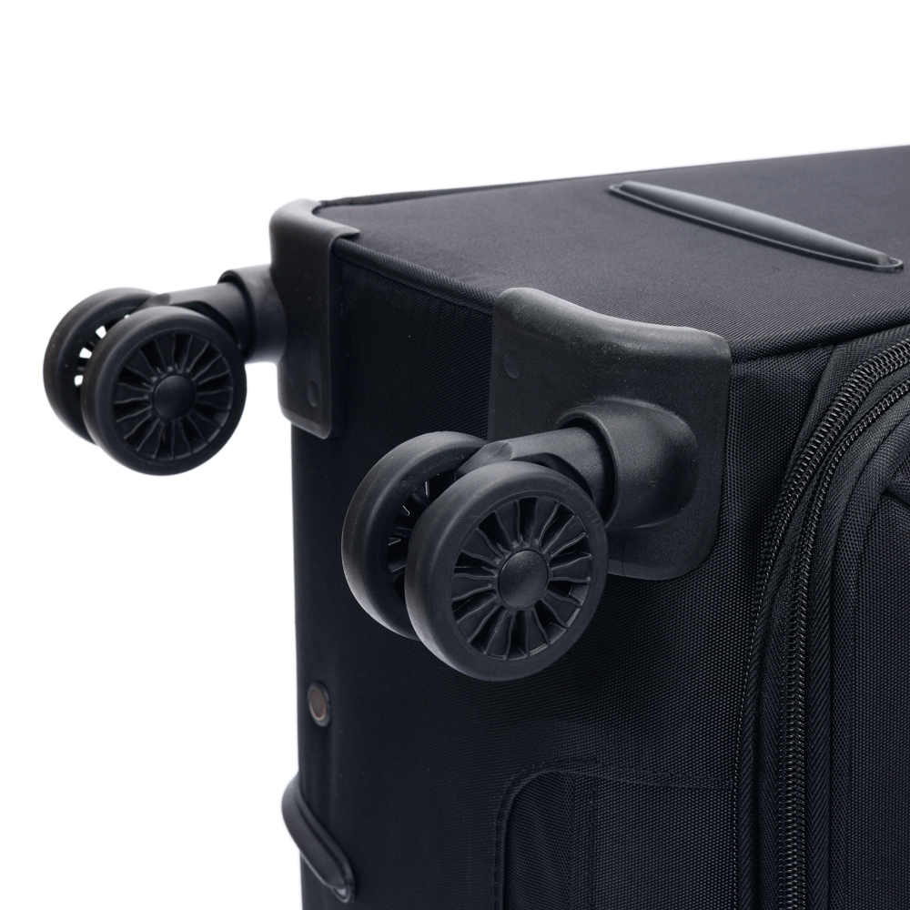 Легкая регулируемая телескопическая алюминиевая ручка и система из четырёх двойных колёс, вращающихся на 360 градусов, обеспечивает мягкий ход и свободное движение во всех направлениях.