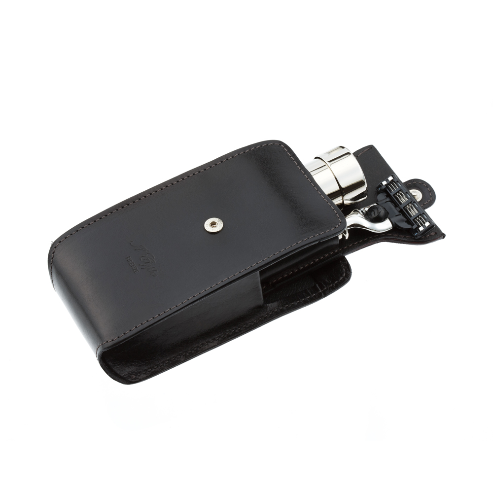 Чехол ручной работы из черной натуральной кожи, изготовленный во флорентийском стиле, плотно вмещает бритву и помазок. Помазок помещается в тубус с помощью удобного поворотного механизма и закрывается колпачком, что отлично защищает его в дороге. Кисть помазка в дорожных наборах изготовлена из натурального барсучьего ворса. Кисти этого типа взбивают отличную плотную пену, это возможно благодаря хорошей способности барсучьего ворса удерживать влагу. Исключительная мягкость барсучьего ворса не вызывает дискомфорта при нанесении пены даже у обладателей чувствительной кожи. Бритвенный станок из никелированной латуни c лезвием Gillette MACH3 обеспечивает прекрасное бритье, оставляя кожу гладкой и мягкой.
