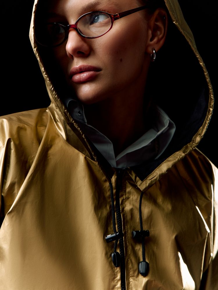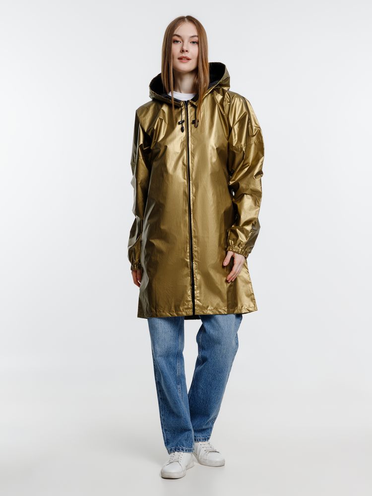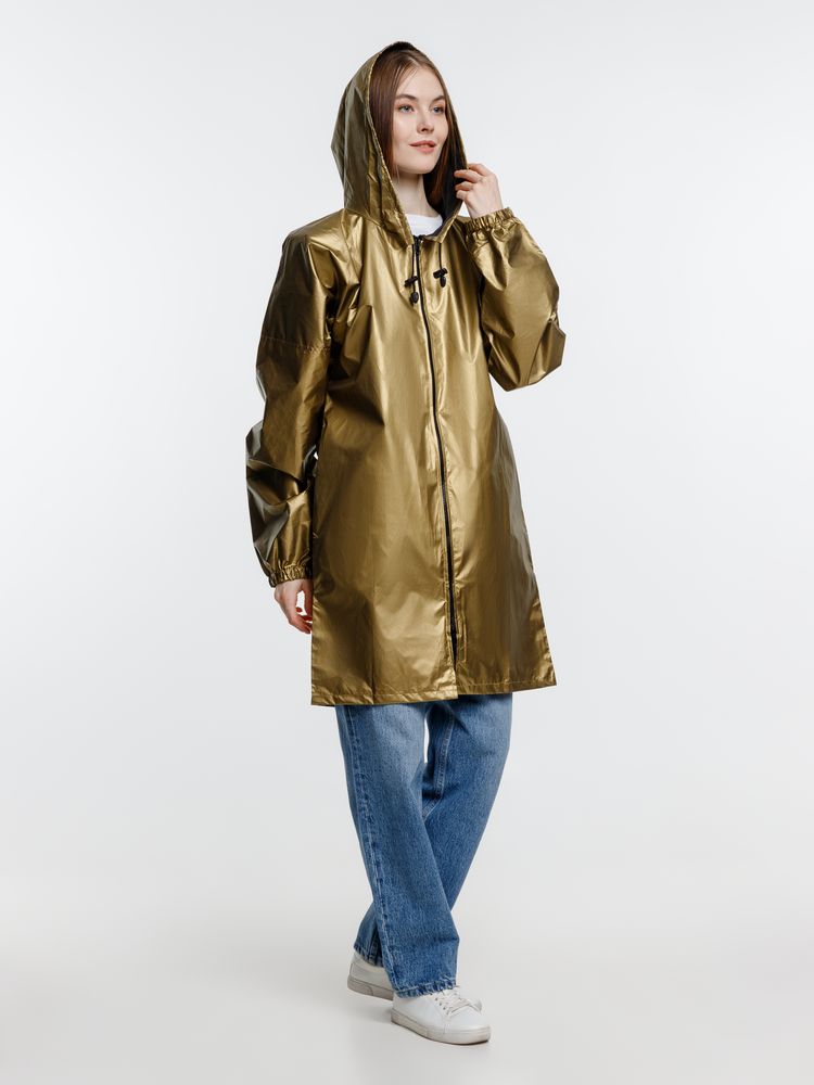 Плащ-дождевик из ткани таффета на молнии с капюшоном. Складывается в мешочек — удобно брать с собой.