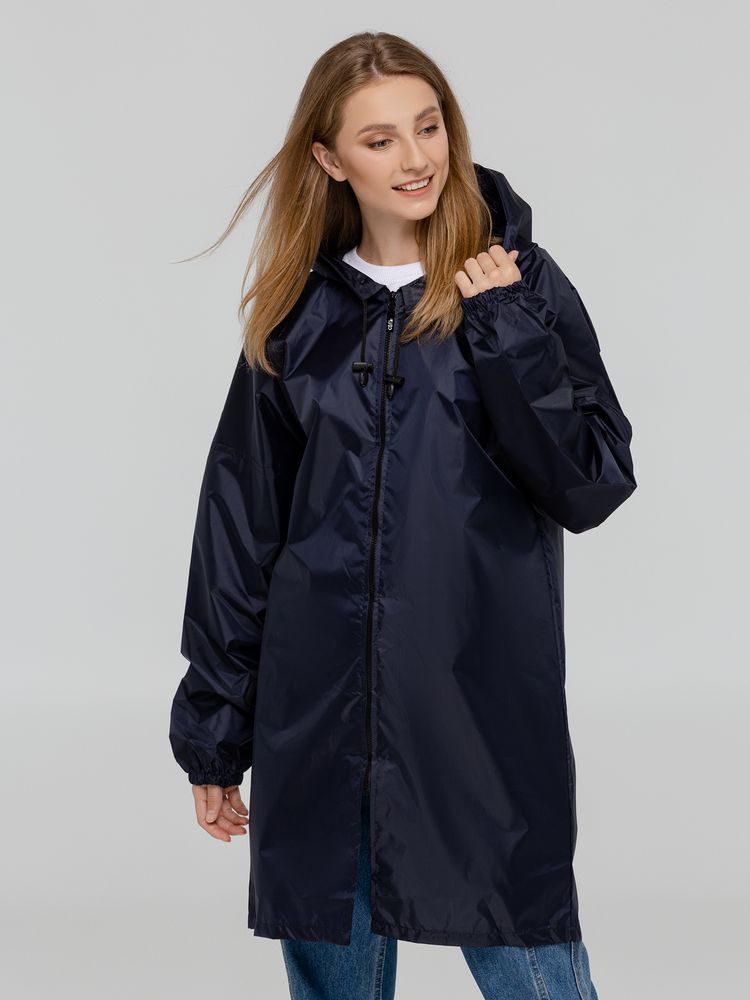 Плащ-дождевик из ткани таффета на молнии с капюшоном. Складывается в мешочек — удобно брать с собой.