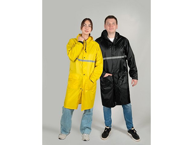 Светоотражающая тесьма на груди и спине делает человека в плаще заметным даже в темное время суток. Вместительные накладные карманы защищены сверху клапаном.