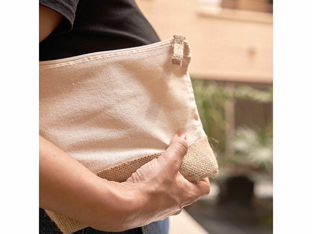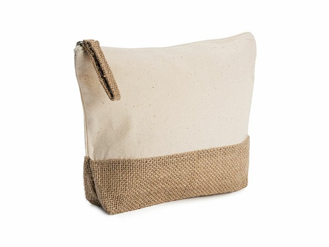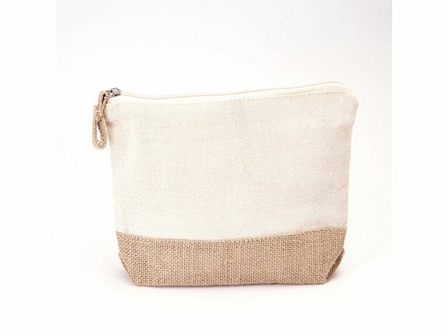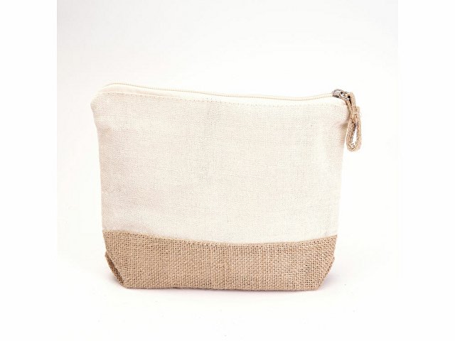 Эко-косметичка из хлопка и джута плотностью 180 г/м² натурального цвета с нижней частью и язычком из джута и застежкой-молнией в тон. Термотрансфер (1 цвет (цветные изделия)) на данный товар осуществляется бесплатно. Оплачивается только настройка оборудования в размере 10000 рублей на весь тираж.