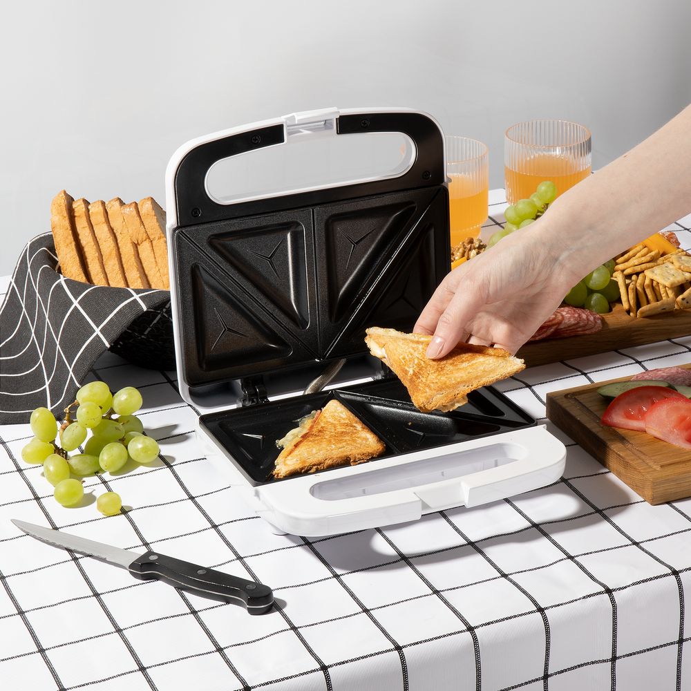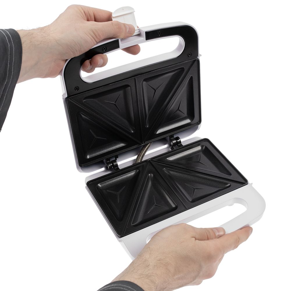 Сэнвичница быстро разогревается и поджаривает бутерброд в считанные минуты. Равномерно прогревающиеся панели с антипригарным покрытием позволяют быстро и качественно приготовить вкусную закуску с разными начинкам, а затем легко очистить прибор. Покрытие устойчиво к механическим повреждениям и не вступает в химические реакции с ингредиентами.