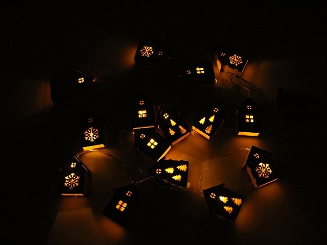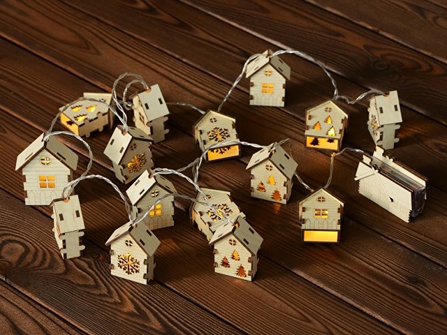 Светодиодная новогодняя елочная гирлянда постоянного свечения с домиками из натуральной березовой фанеры. Работает от 2-х батареек АА (в комплекте). Гравировка (CO2 лазер) (Без чернения) на данный товар осуществляется бесплатно. Оплачивается только настройка оборудования в размере 1100 рублей на весь тираж.