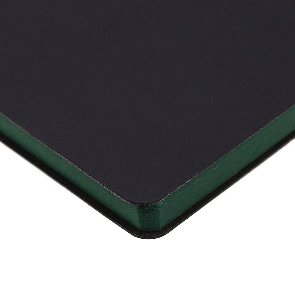Ежедневник с гибкой обложкой, выполнен из материала Soft Touch, черный АА, дополнен петлей для ручки из материала Nice Touch, зеленый FF и цветным ляссе.