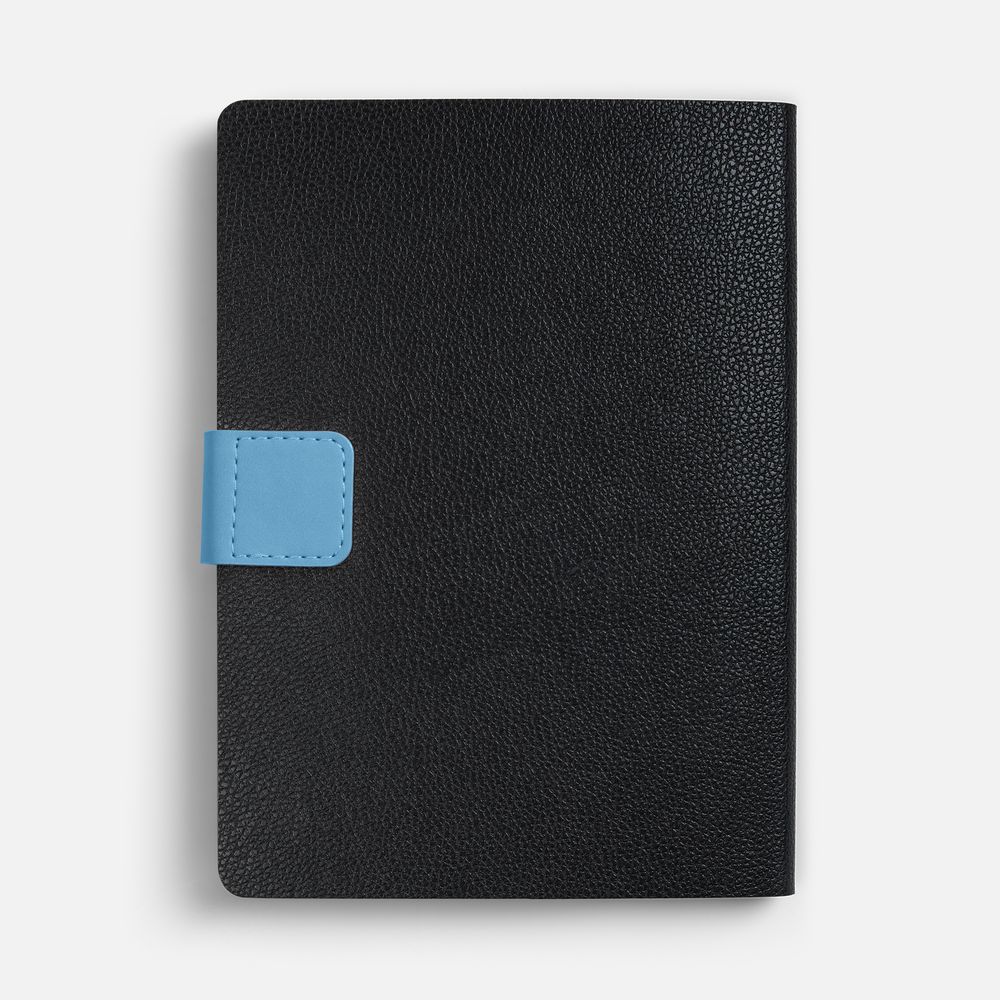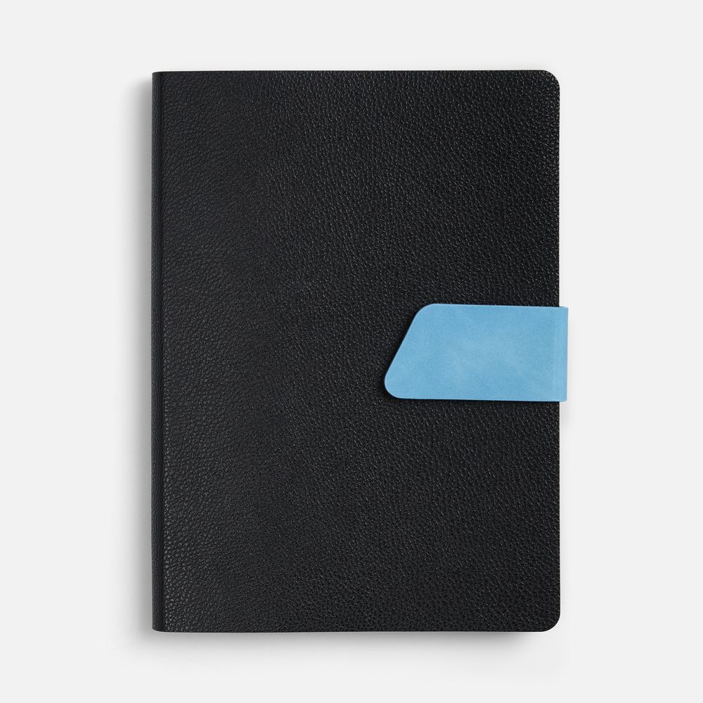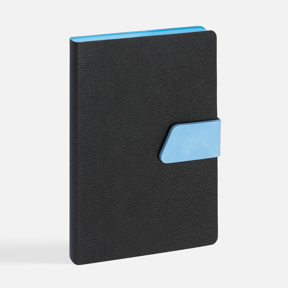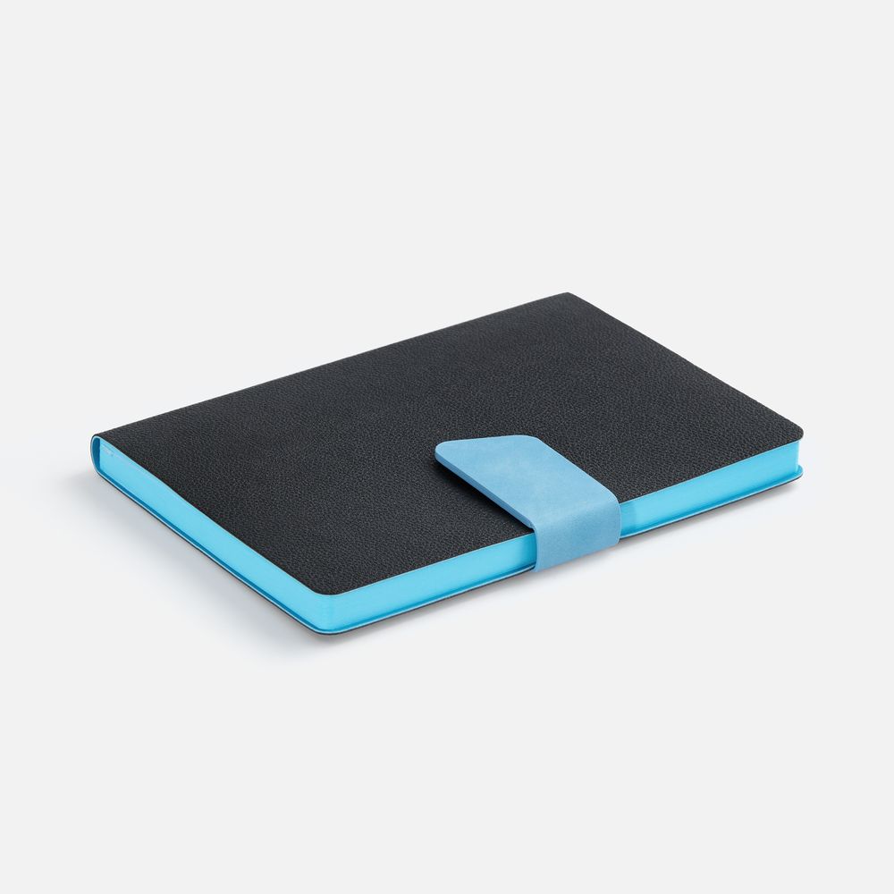 Ежедневник с гибкой обложкой, выполнен из материала La Fite, черный АА и Nubuck Touch, синий, дополнен синим ляссе и хлястиком на кнопке.