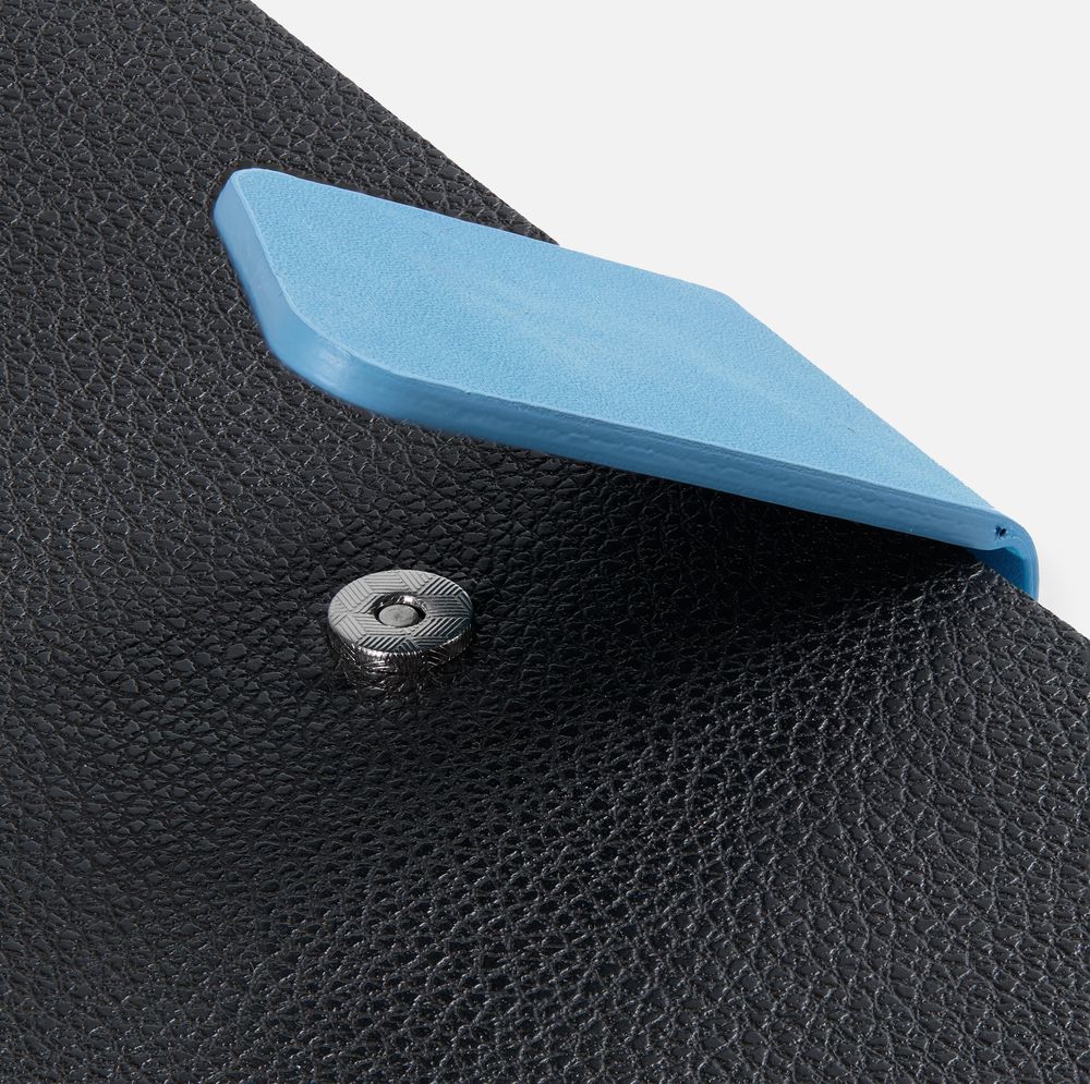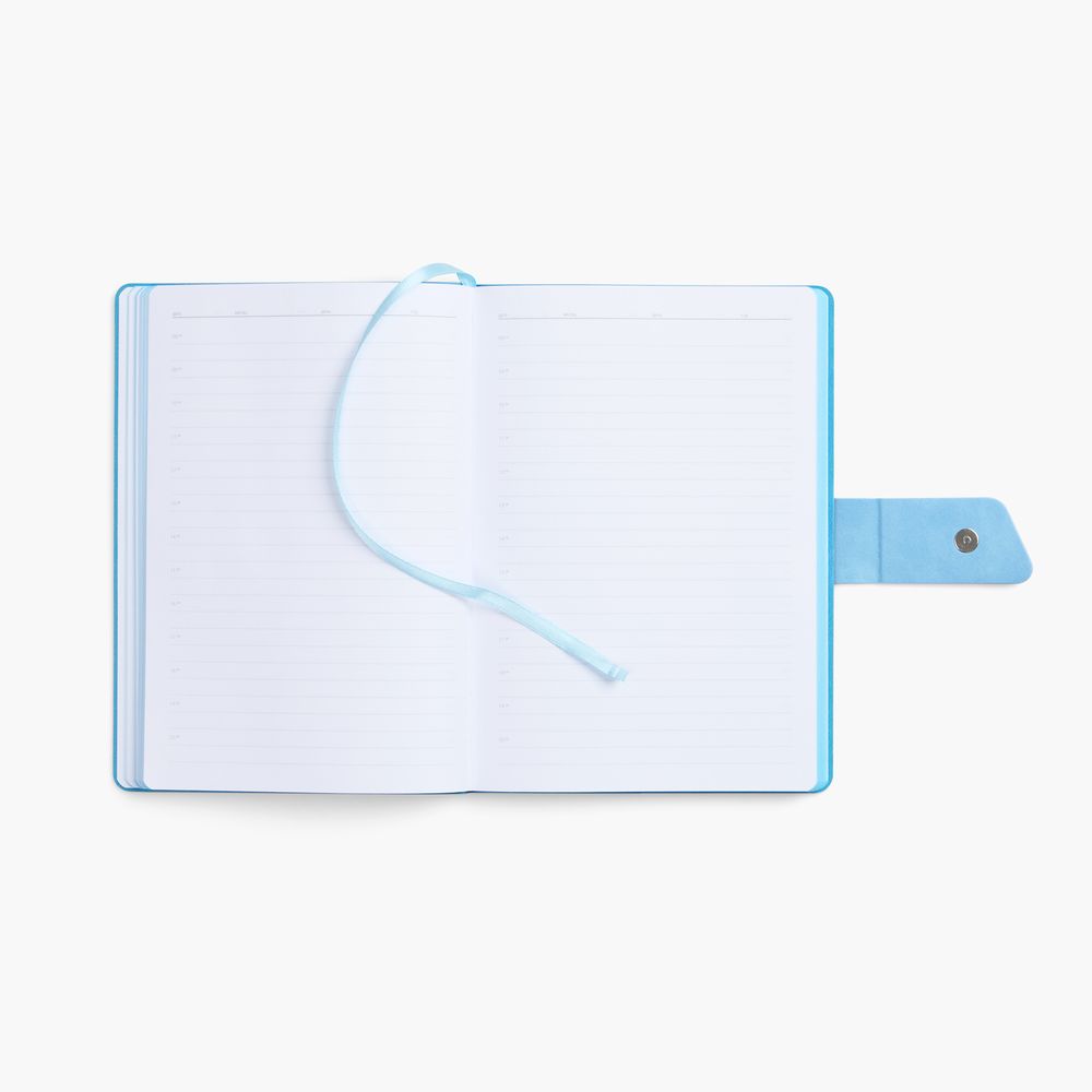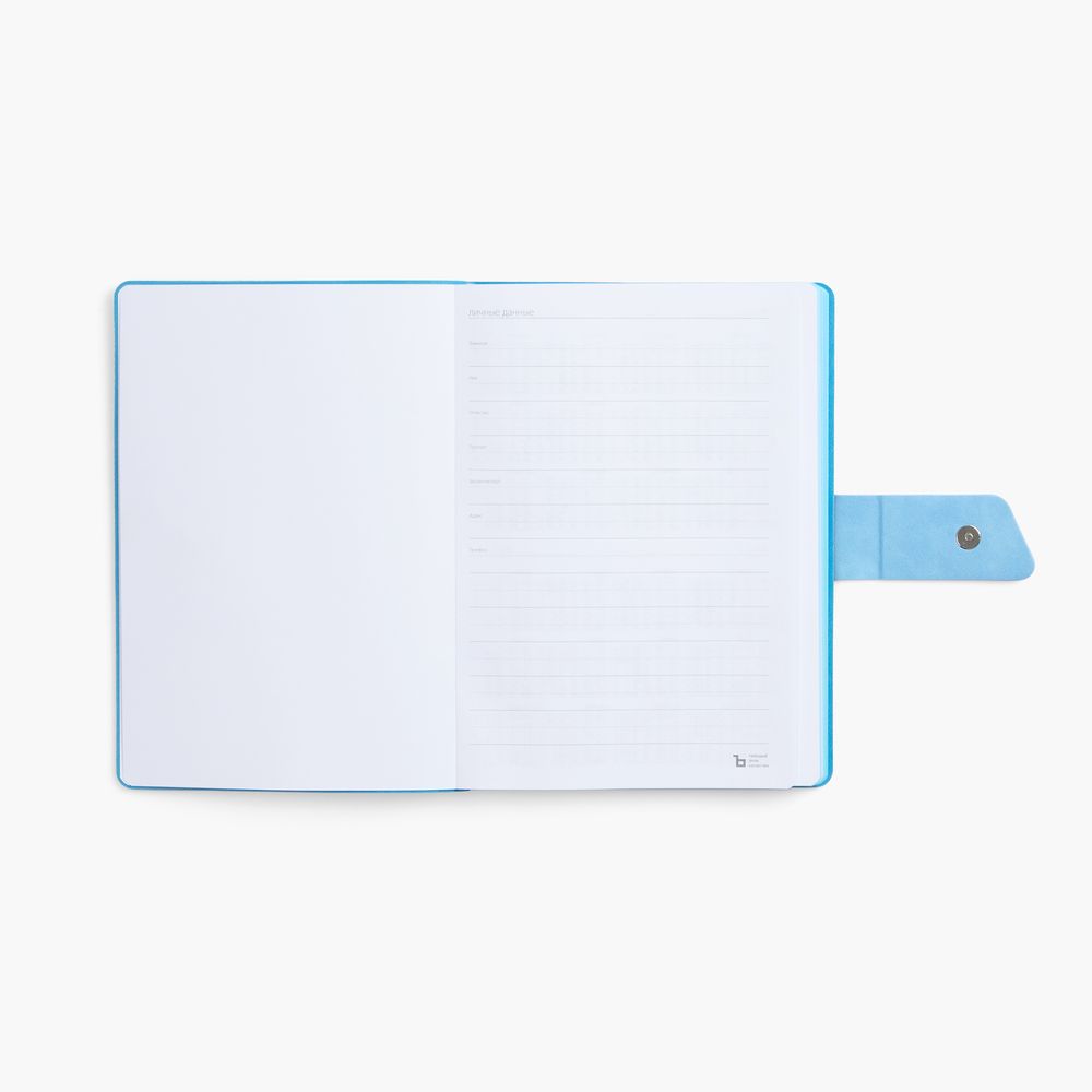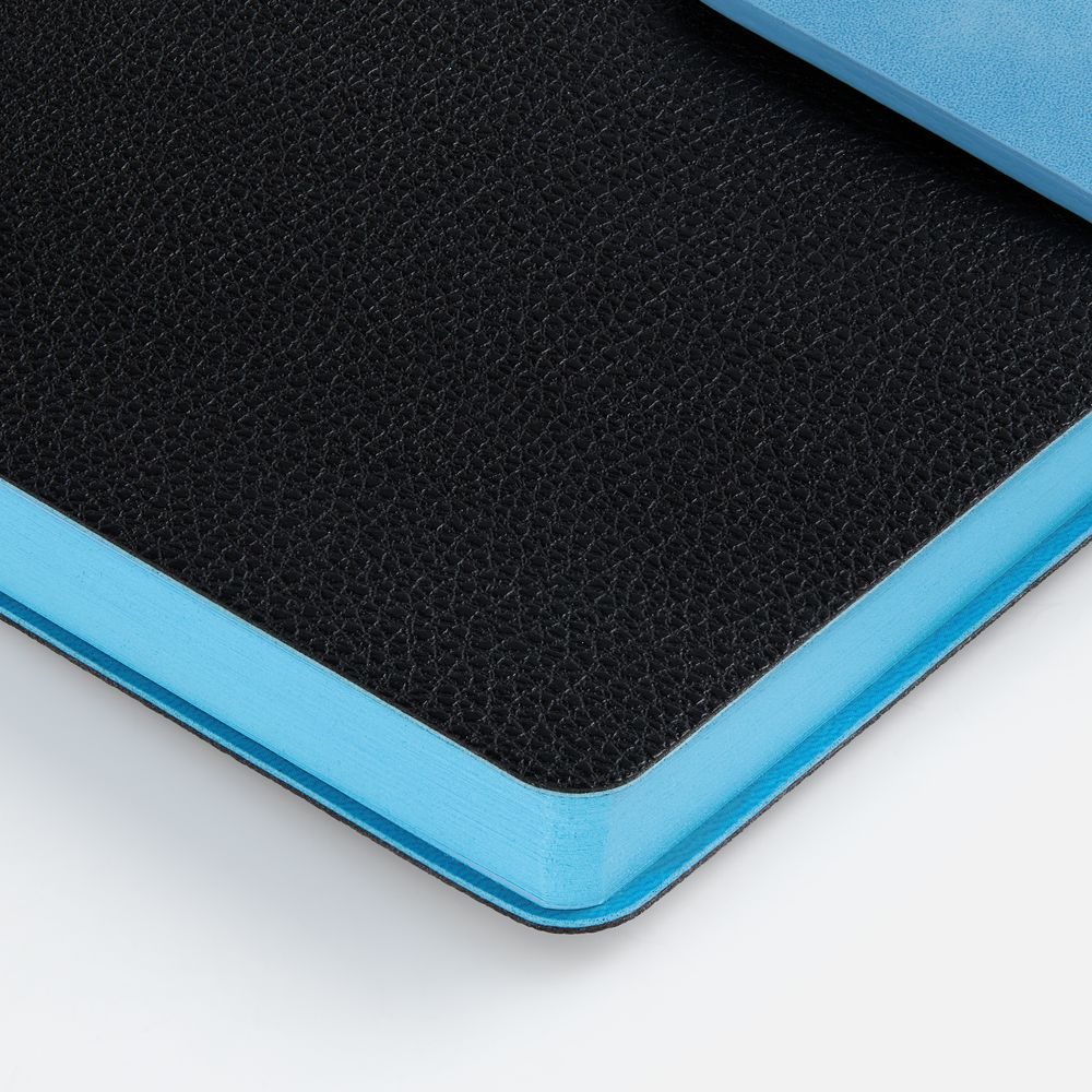 Ежедневник с гибкой обложкой, выполнен из материала La Fite, черный АА и Nubuck Touch, синий, дополнен синим ляссе и хлястиком на кнопке.