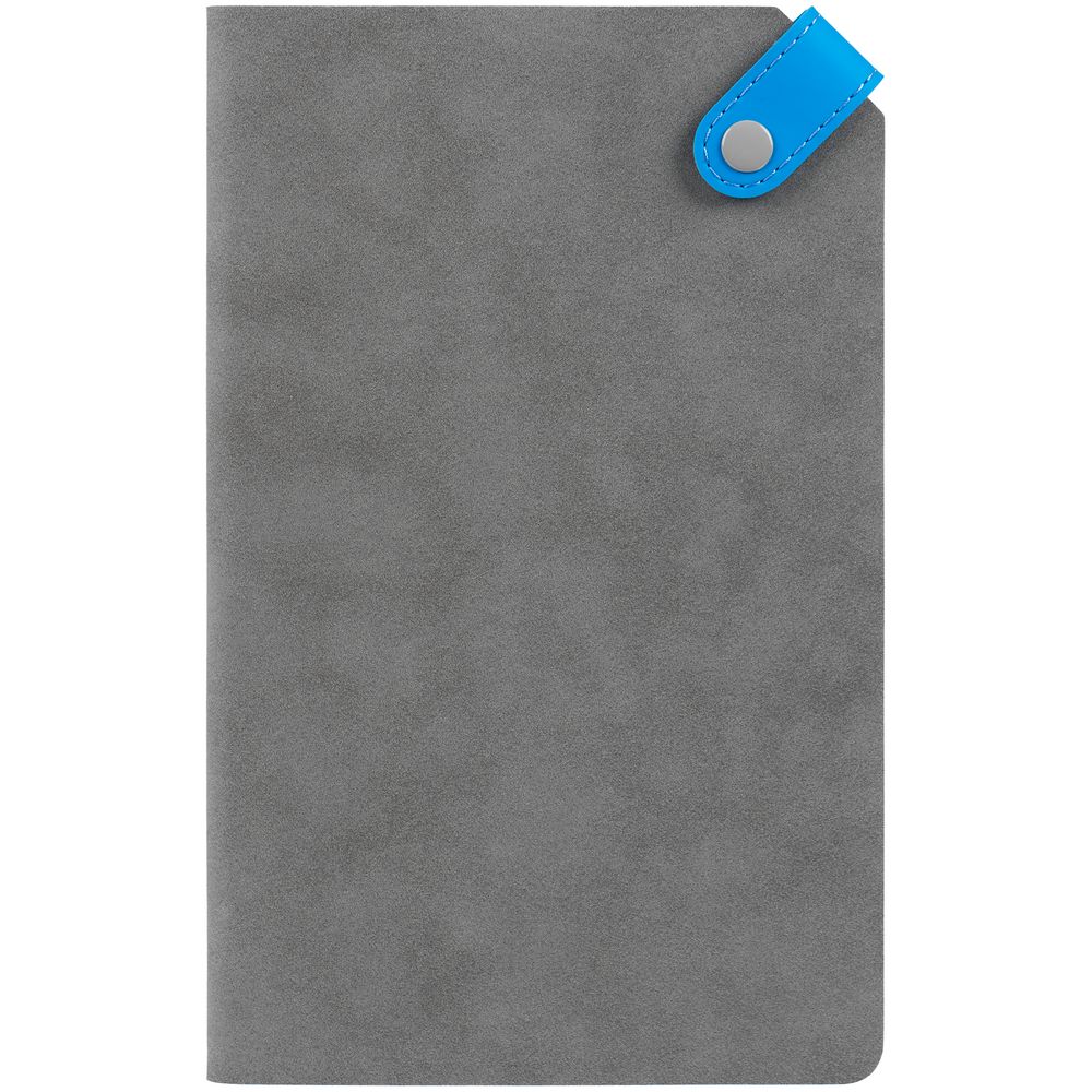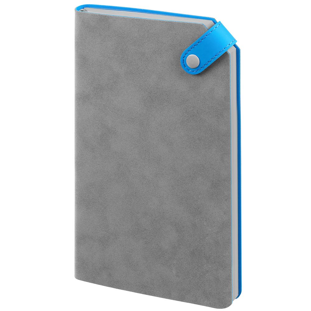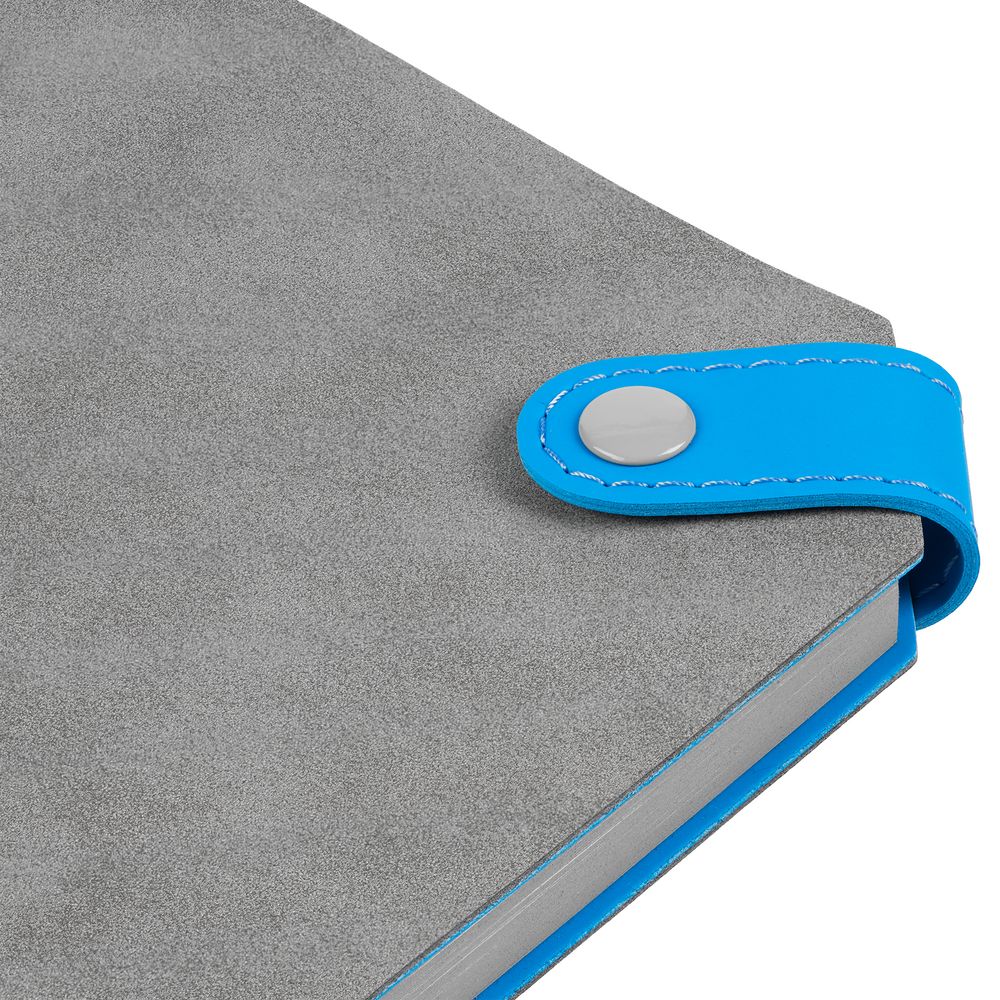 Ежедневник с гибкой обложкой, выполнен из материала Nubuck, серый СС и Soft Touch Ultra, синий; дополнен серым ляссе и хлястиком на кнопке.