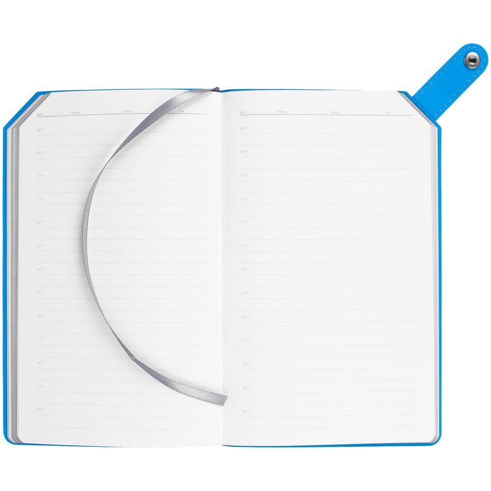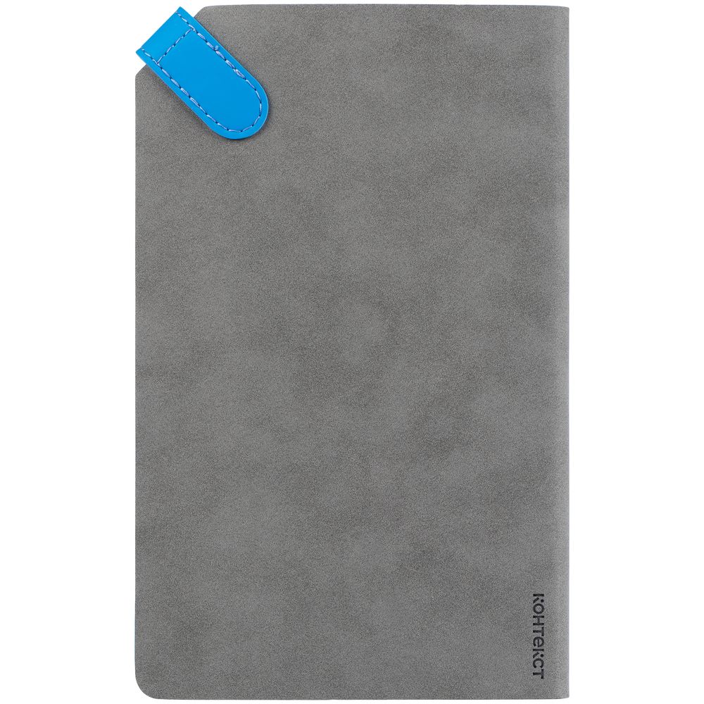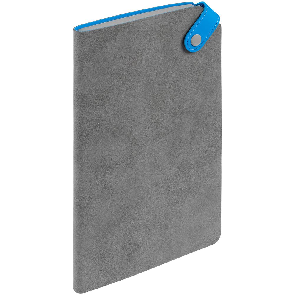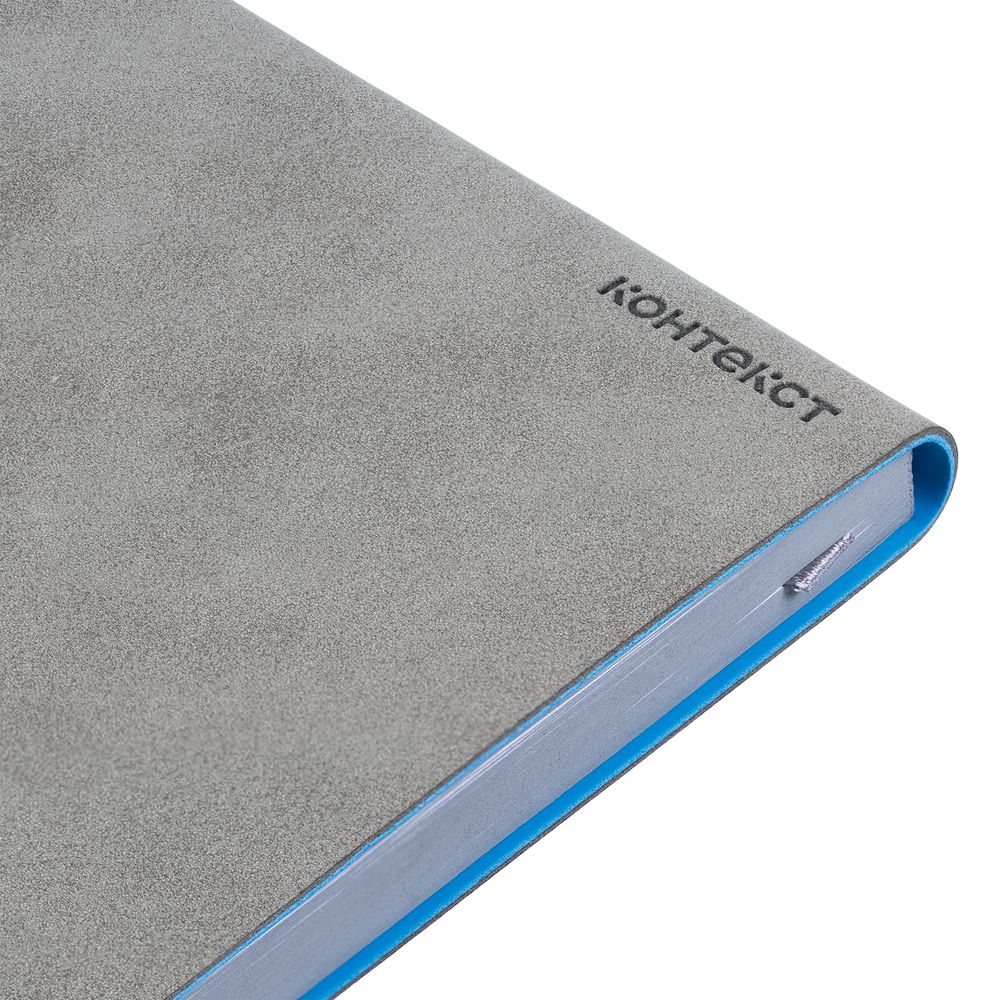 Ежедневник с гибкой обложкой, выполнен из материала Nubuck, серый СС и Soft Touch Ultra, синий; дополнен серым ляссе и хлястиком на кнопке.