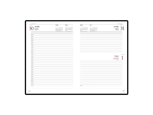 Благородство и статусность придают ежедневнику отстрочка по периметру в тон, скругленные углы, закладка-ляссе бордового цвета, золотой срез.