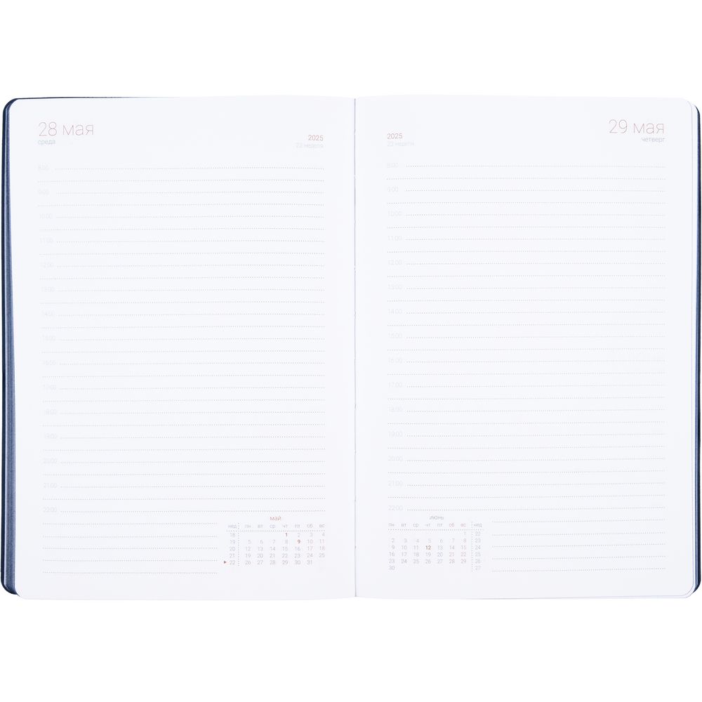 Гибкая обложка ежедневника выполнена из материала Latte, темно-синий XX. Внутри корешка — специальное место для крепления ручки размером до 15х0,9 см.