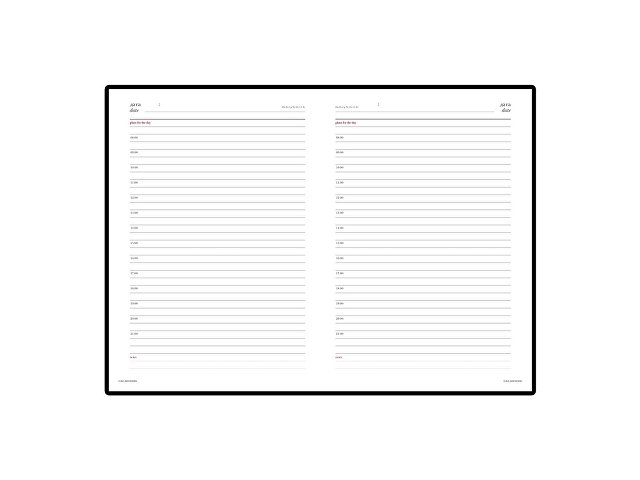Две строчки на каждой странице отведены на ежедневное планирование. Есть почасовая разбивка страниц. Две последние строчки служат для комментариев. Строгий классический материал, прекрасная практичная альтернатива дорогостоящей натуральной коже. Идеально сочетается с тиснением фольгой. Тиснение (Блинт) на данный товар осуществляется бесплатно. Оплачивается только настройка оборудования в размере 6200 рублей на весь тираж.