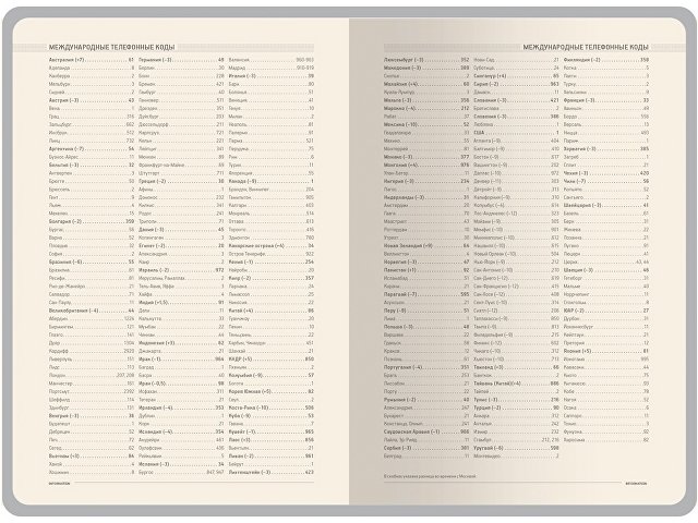 • 19 страниц справочной информации (телефонные коды, буквенные коды, города-миллионники, автомобильные коды, энергетическая и питательная ценность продуктов, национальные праздники, скорость, давление, температура, страны мира, единицы измерения, штрихкоды, термины международной торговли, греческие буквы, размеры одежды, формат бумаги, религиозные праздники, аэропорты Европы, допустимое содержание алкоголя в крови, время распада алкоголя в крови);