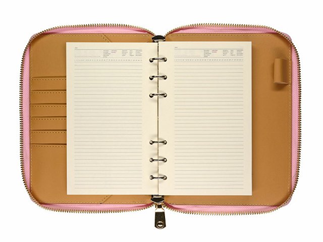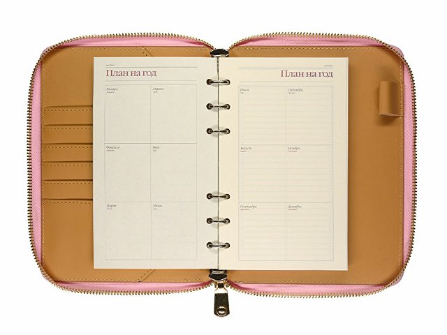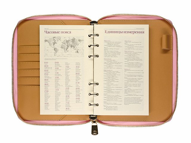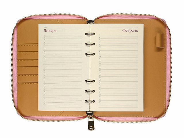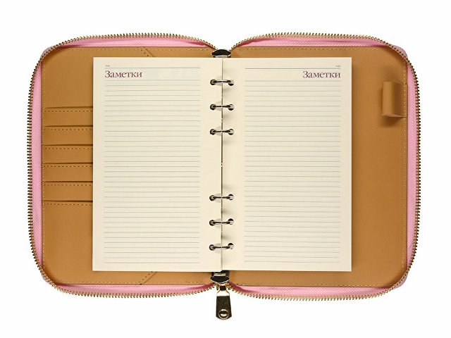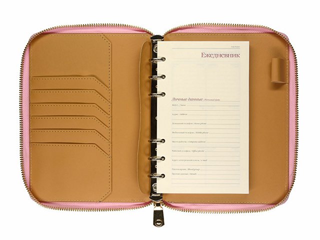 Деловая нежность! Вот как можно охарактеризовать этот очаровательный розово-зефирный ежедневник. Большое отделение на молнии вмещает в себя и сменный блок для записей на кольцевом механизме, и отделения для визиток и ручки. В этом бизнес-аксессуаре поместятся и дополнительные документы и смартфон. Тиснение (Блинт) на данный товар осуществляется бесплатно. Оплачивается только настройка оборудования в размере 6200 рублей на весь тираж.
