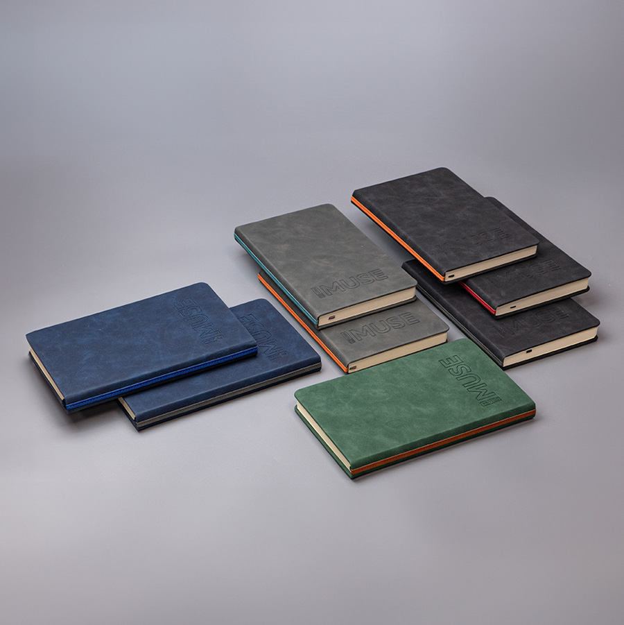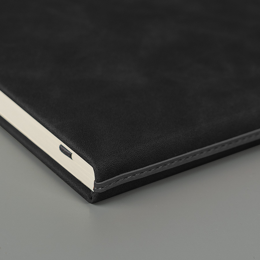 Ежедневник недатированный MuseЦвет обложки черный, декоративная полоса, цвет серыйРазмер 130*210 мм, переплет твердыйОбложка термоактивный PU, с эффектом замшиБлок недатированный, в линейку, скругленные углыБумага кремовая, плотность 70 г м2Форзац нахцаз кремовые272 страницыЛяссе, 7 мм, в цвет обложкиУпаковка крафтовый сливбокс