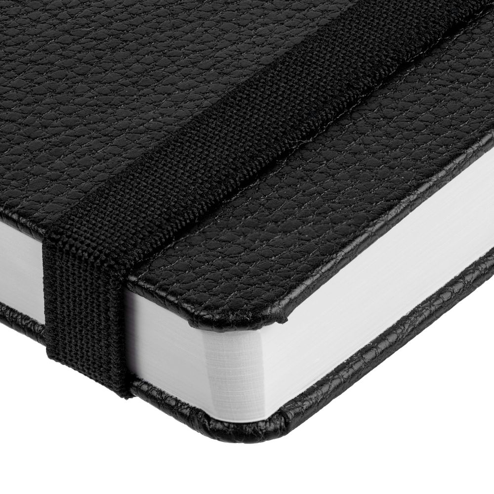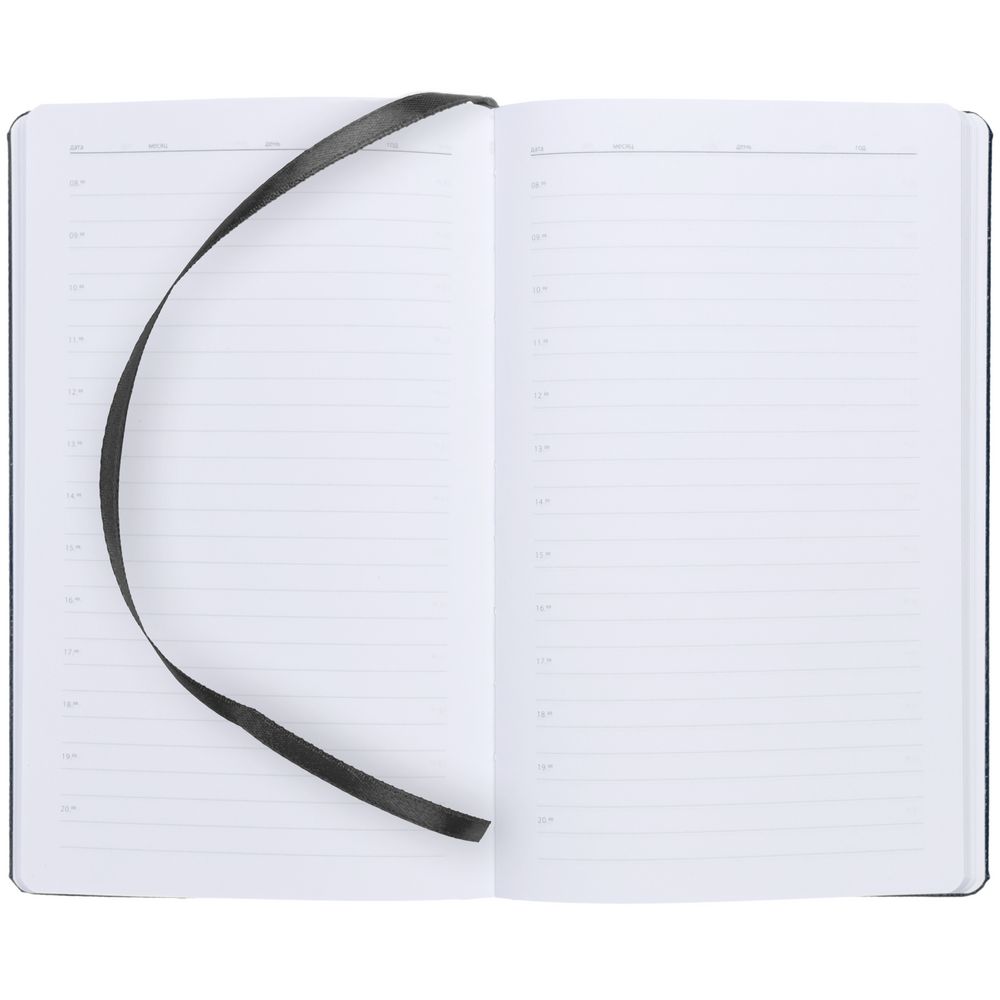 Ежедневник с твердой обложкой, выполнен из материала LaFite, черный АА, дополнен резинкой с металлическим прямоугольным шильдом и ляссе в цвет обложки.