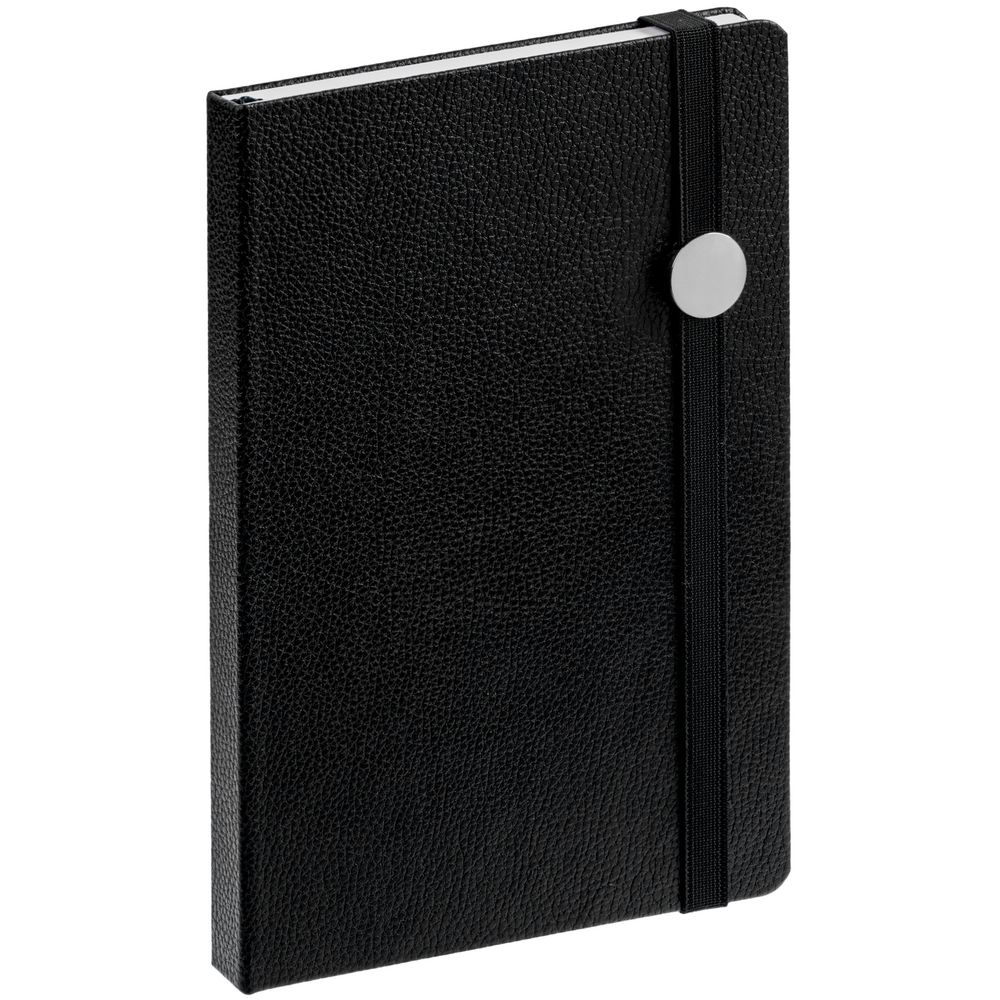 Зауженный ежедневник с круглым металлическим шильдом на резинке.