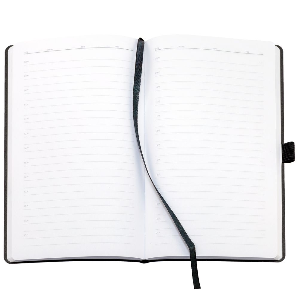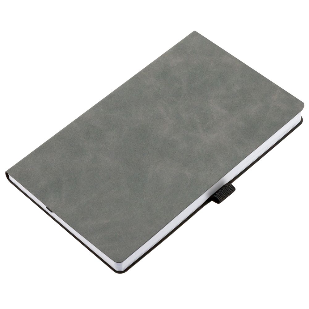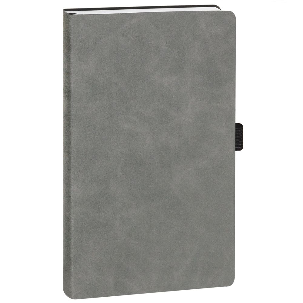 Ежедневник с гибкой обложкой, выполнен из материала Nubuck Touch, серый СС, дополнен ляссе и петлей-резинкой для ручки черного цвета.