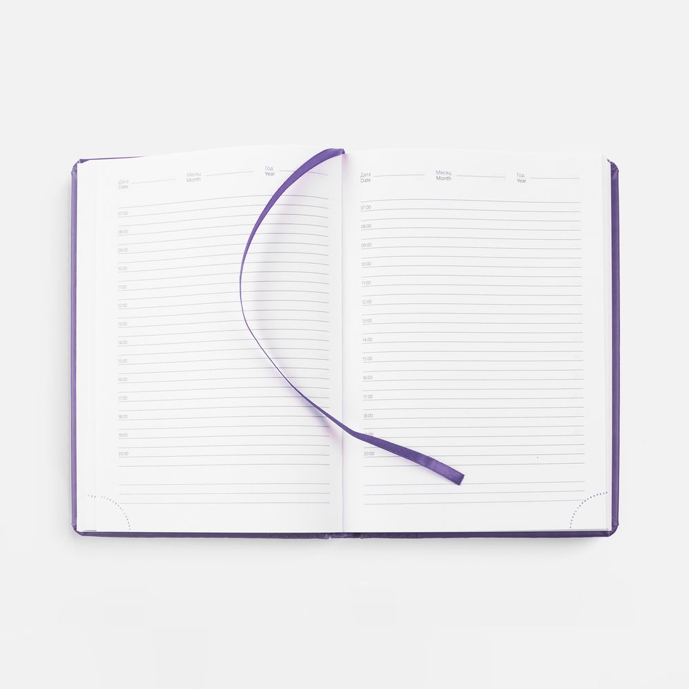 Ежедневник с твердой обложкой, выполнен из материала Waltz, фиолетовый UU, дополнен ляссе в цвет материала.