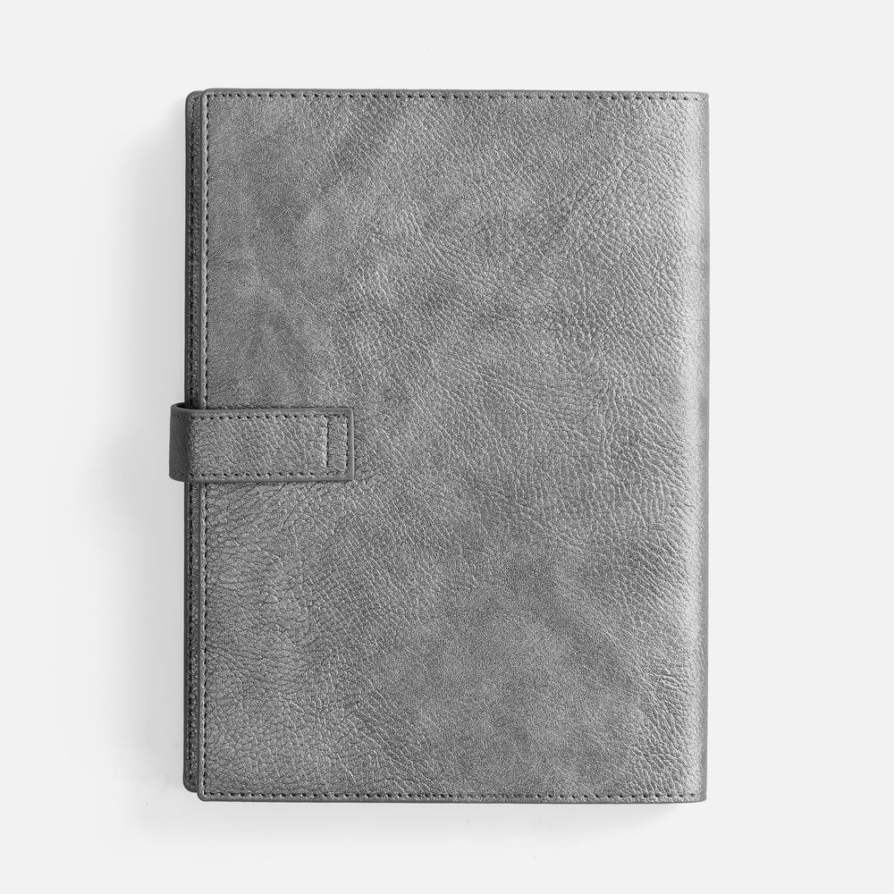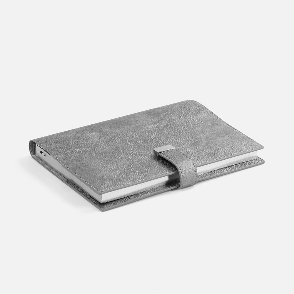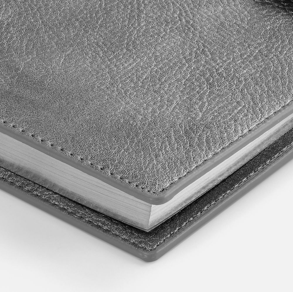 Ежедневник в мягком переплете со съёмная обложкой, дополнен застёжкой-хлястиком с металлическим шильдом на кнопке, двойным ляссе и капталом.